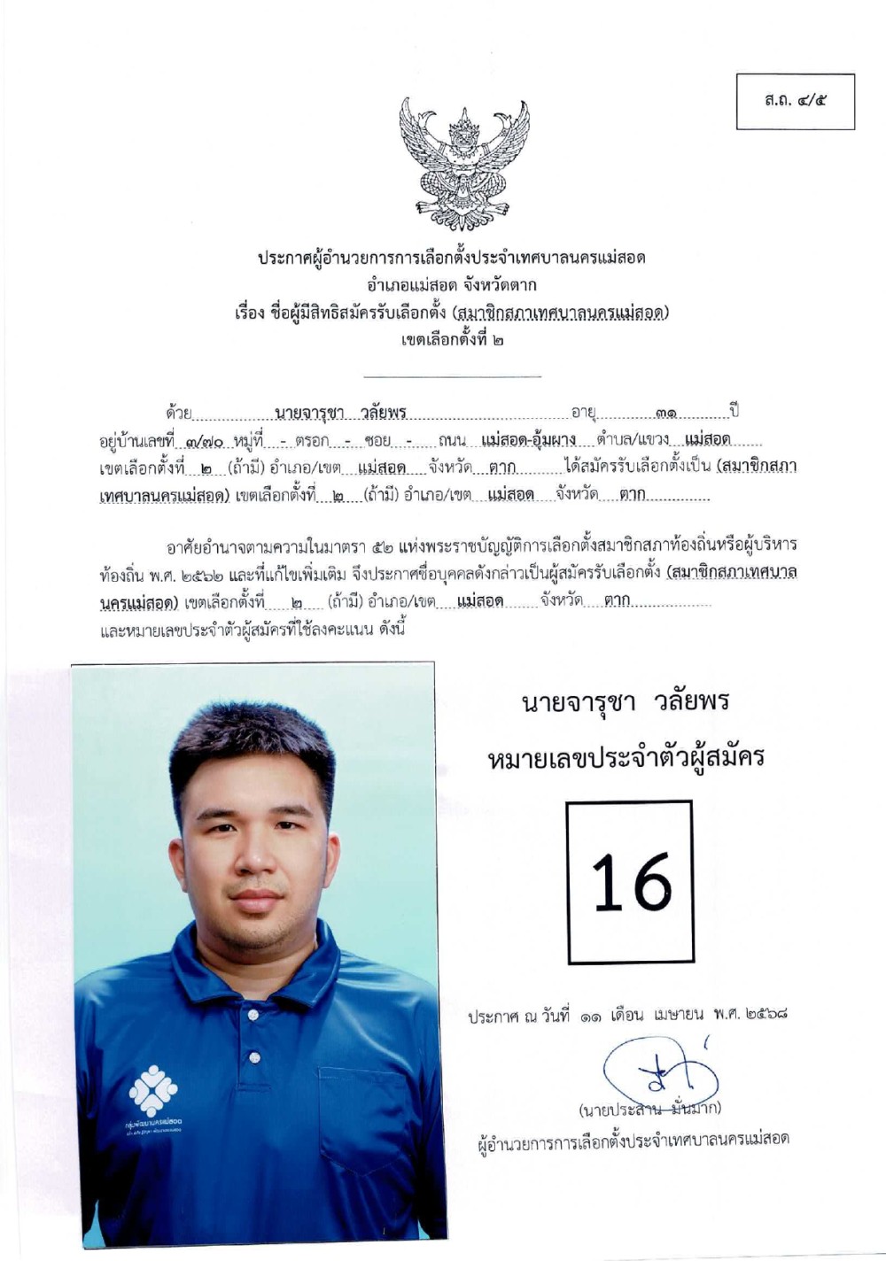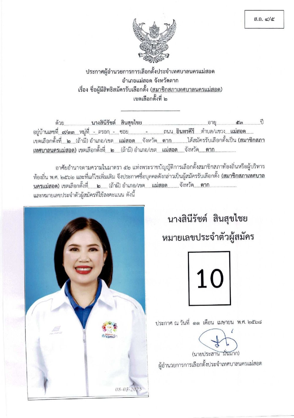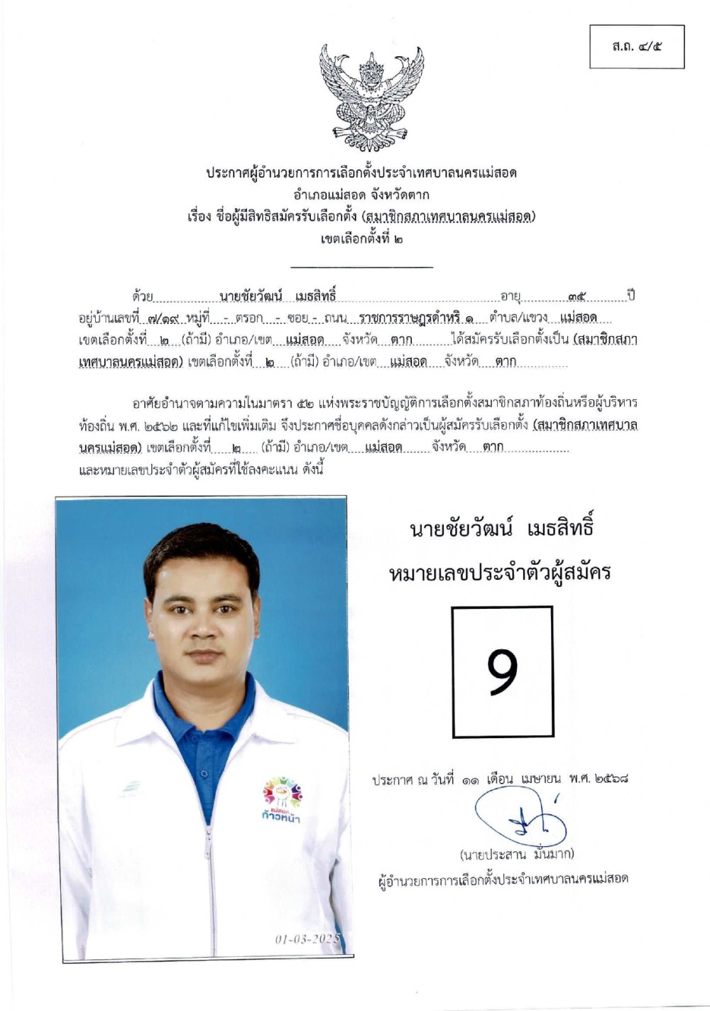 ประกาศเทศบาลนครแม่สอด เรื่อง ชื่อผู้มีสิทธิสมัครรับเลือกตั้ง สมาชิกสภาเทศบาลนครแม่สอด เขตเลือกตั้งที่ 2