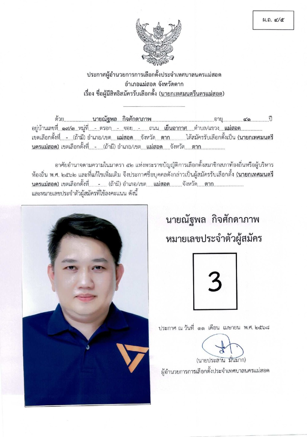 ประกาศเทศบาลนครแม่สอด เรื่อง ชื่อผู้มีสิทธิสมัครรับเลือกตั้ง นายกเทศมนตรีนครแม่สอด