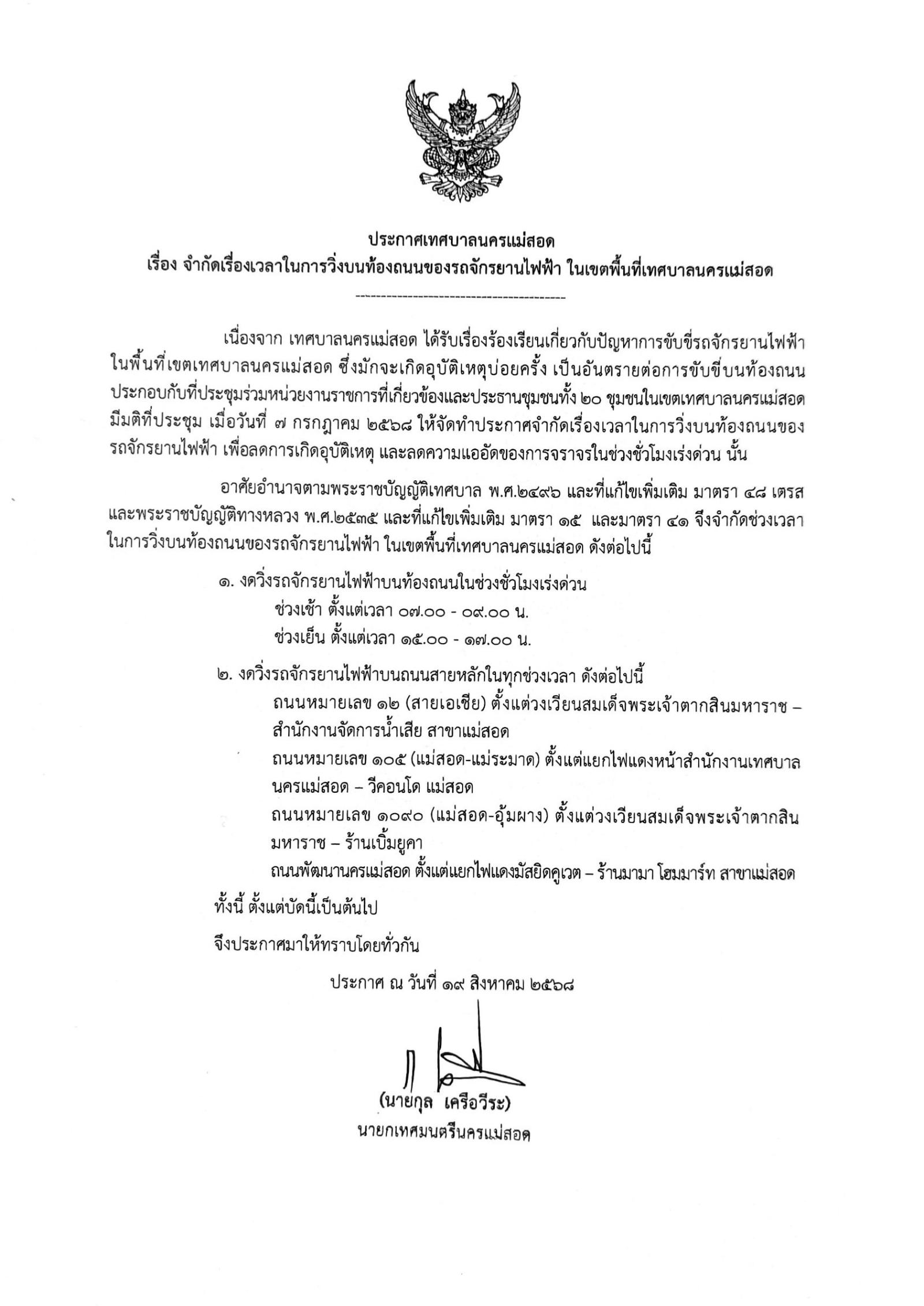 เนื่องจากเทศบาลนครแม่สอดได้รับเรื่องร้องเรียนเกี่ยวกับปัญหาการขับขี่รถจักรยานไฟฟ้าพื้นที่เขตเทศบาลนครแม่สอด ซึ่งมักจะเกิดอุบัติเหตุบ่อยครั้ง เป็นอันตรายต่อการขับขี่บนประกอบกับที่ประชุมร่วมหน่วยงานราชการที่เกี่ยวข้องและประธานชุมชนทั้ง 20 ขุมขนในเขตเทศบาลนครแม่สอดมีมติที่ประชุม เมื่อวันที่ 7 กรกฎาคม 2568 ให้จัดทำประกาศจำกัดเรื่องเวลาในการวิ่งบนท้องถนขอนของรถจักรยานไฟฟ้า เพื่อลดการเกิดอุบัติเหตุ และลดความแออัดของการจราจรในช่วงชั่วโมงเร่งด่วอาศัยอำนาจตามพระราชบัญญัติเทศบาล พ.ศ.2569 และที่แก้ไขเพิ่มเติม มาตรา 488 เตรส และพระราชบัญญัติทางหลวง พ.ศ.2535 และที่แก้ไขเพิ่มเติม มาตรา 15 และมาตรา 41 จึงจำกัดช่วงเวลาในการวิ่งบนท้องถนนของรถจักรยานไฟฟ้า ในเขตพื้นที่เทศบาลนครแม่สอด ดังต่อไปนี้ ๑. งดวิ่งรถจักรยานไฟฟ้านท้องถนนในช่วงชั่วโมงเร่งด่วน ช่วงเช้า ตั้งแต่เวลา ๐๗.๐๐ - ๐๙.๐๐ น. ช่วงเย็น ตั้งแต่เวลา ๑๕.๐๐ - ๑๗.๐๐ น. ๒. งดวิ่งรถจักรยานไฟฟ้าบนถนนสายหลักในทุกช่วงเวลา ดังต่อไปนี้ ถนนหมายเลข ๑๒ (สายเอเชีย) ตั้งแต่วงเวียนสมเด็จพระเจ้าตากสินมหาราช - สำนักงานจัดการน้ำเสีย สาขาแม่สอด ถนนหมายเลข ๑๐๕ (แม่สอด-แม่ระมาด) ตั้งแต่แยกไฟแดงหน้าสำนักงานเทศบาลนครแม่สอด - วีคอนโด แม่สอด ถนนหมายเลข ๑๐๙๐ (แม่สอด-อุ้มผาง) ตั้งแต่วงเวียนสมเด็จพระเจ้าตากสินมหาราช - ร้านเบิ้มยูคา ถนนพัฒนานครแม่สอด ตั้งแต่แยกไฟแดงมัสยิดคูเวต - ร้านมามา โฮมมาร์ท สาขาแม่สอด * ทั้งนี้ ตั้งแต่บัดนี้เป็นต้นไป จึงประกาศมาให้ทราบโดยทั่วกัน
