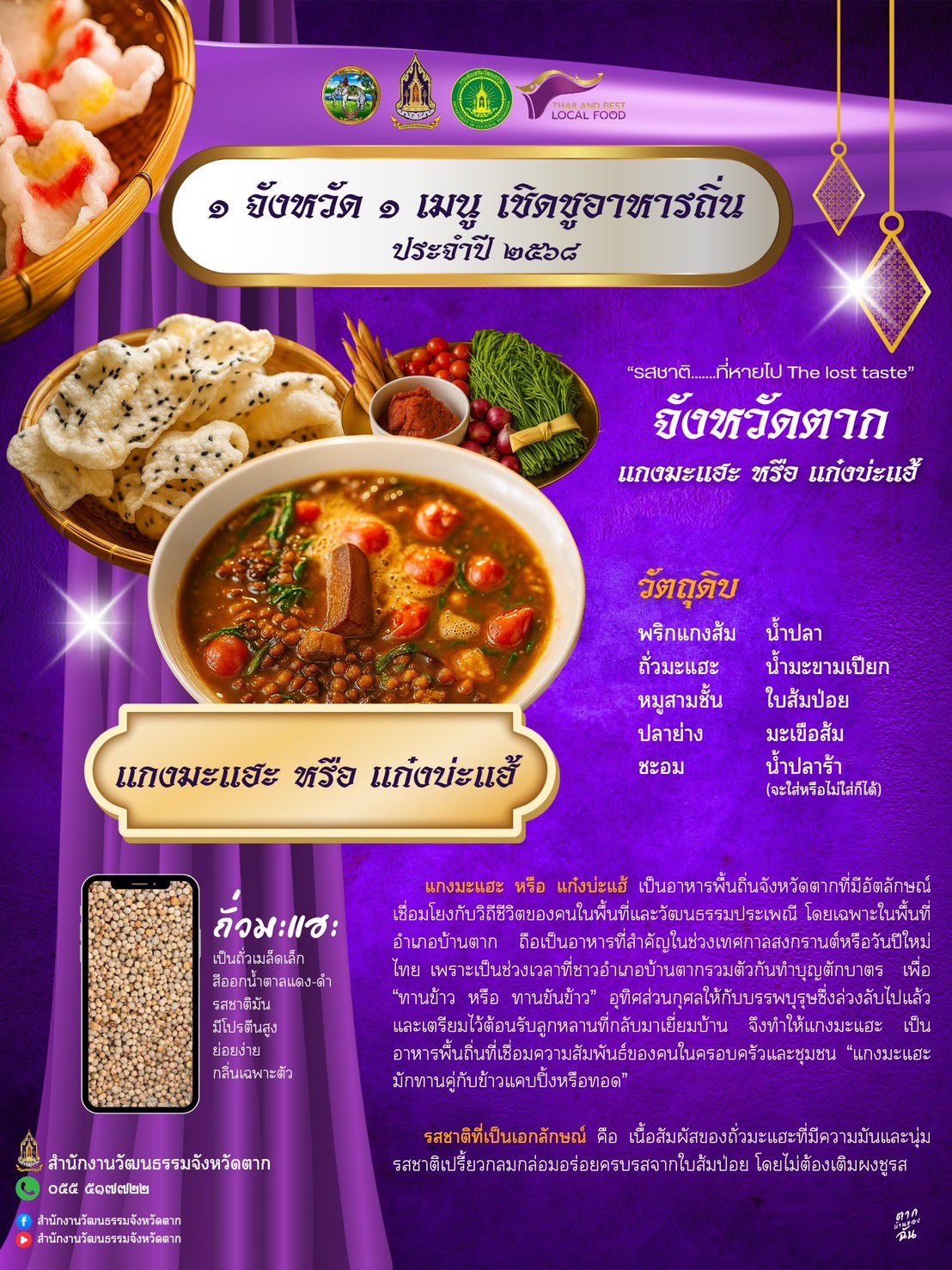 เทศบาลนครแม่สอด ขอประชาสัมพันธ์ ประกาศผลโหวตเมนูอาหารถิ่นจังหวัดตาก “1 จังหวัด 1 เมนู เชิดชูอาหารถิ่นรสชาติ...ที่หายไป The Lost Taste” ประจำปี พ.ศ. 2568 (ซึ่งผลโหวตเมนูอาหารถิ่นจังหวัดตากปรากฏว่า แกงมะแฮะ ได้รับคะแนนผลโหวตสูงสุด)