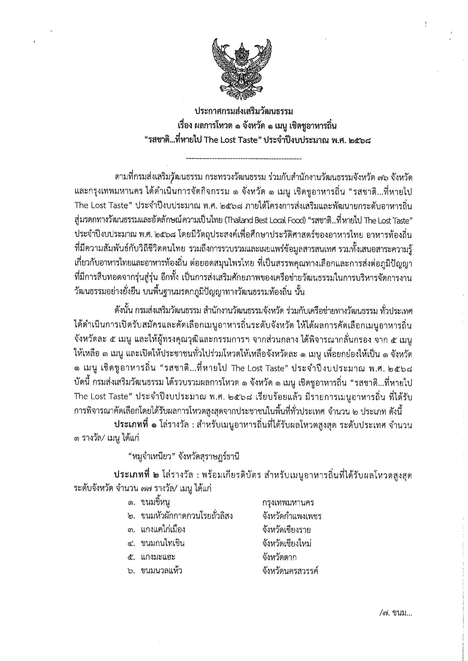สู่มรดกทางวัฒนธรรมและอัตลักษณ์ความเป็นไทย (Thailand Best Local Food) "รสชาติที่หายไป The Lost Taste" ประจำปี 2568 เพื่อศึกษาประวัติศาสตร์ของอาหารไทย อาหารท้องถิ่น ที่มีความสัมพันธ์กับวิถีชีวิตคนไทย รวมถึง การรวบรวมและเผยแพร่ข้อมูลสารสนเทศ เสนอสาระความรู้เกี่ยวกับอาหารไทยและอาหารท้องถิ่น ต่อยอดสมุนไพรไทย ที่เป็นสรรพคุณทางเลือกและการส่งต่อภูมิปัญญาที่มีการสืบทอดจากรุ่นสู่รุ่น อีกทั้ง เป็นการส่งเสริมศักยภาพของเครือข่ายวัฒนธรรมในการบริหารจัดการงานวัฒนธรรมอย่างยั่งยืน บนพื้นฐานมรตกภูมิปัญญาทางวัฒนธรรมท้องถิ่น นั้น