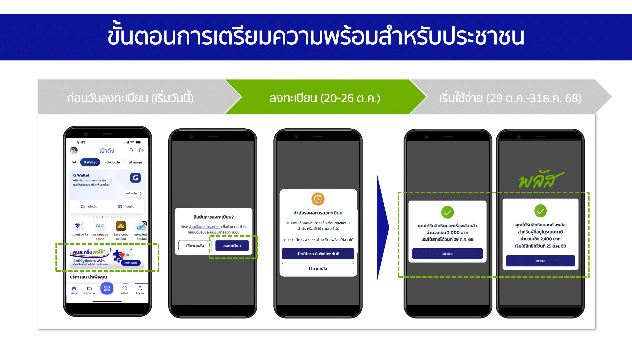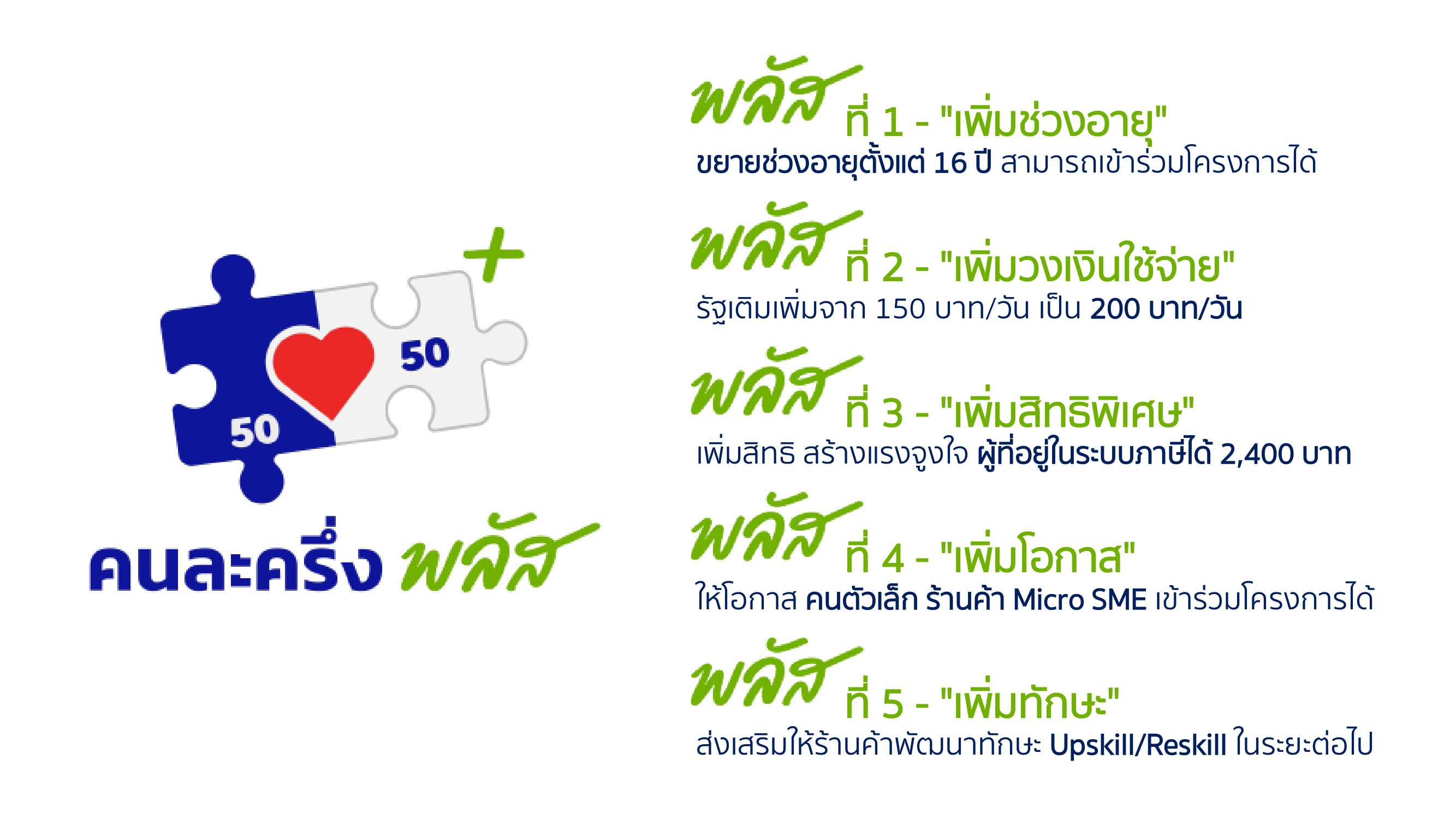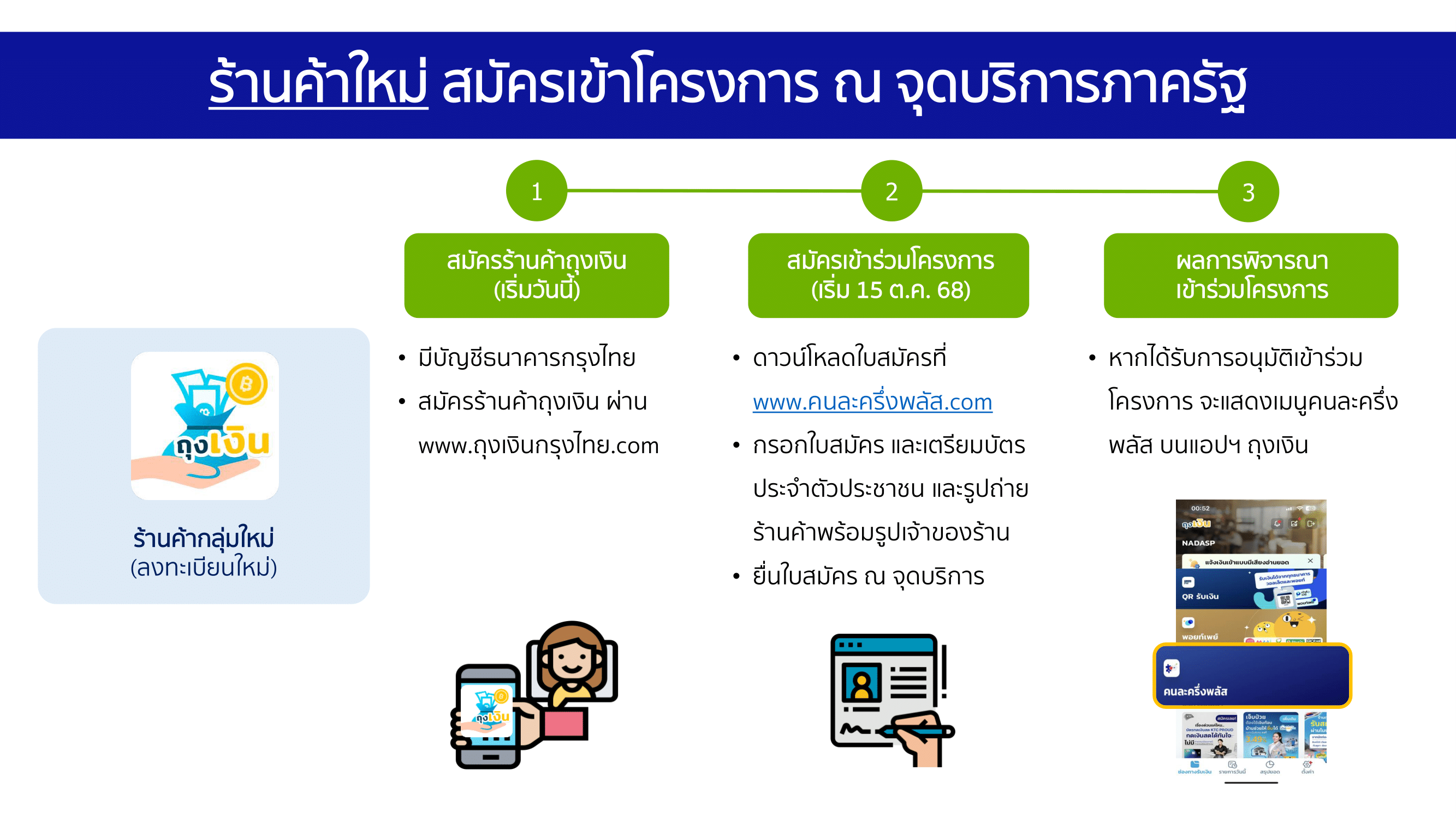 โครงการ “คนละครึ่ง พลัส” หนึ่งในนโยบายเรือธงกระตุ้นเศรษฐกิจของรัฐบาล เพื่อช่วยเหลือประชาชนในการลดรายจ่าย ลดค่าครองชีพ และช่วยสร้างรายได้สำหรับผู้ประกอบการ ร้านค้า โครงการเริ่มตั้งแต่วันที่ 15 ตุลาคม - 31 ธันวาคม 2568 ลงทะเบียนร้านค้าตั้งแต่วันที่ 15 ตุลาคม - 19 ธันวาคม 2568 ผ่านแอปพลิเคชัน “ถุงเงิน” สำหรับประชาชนลงทะเบียน ตั้งแต่วันที่ 20 ตุลาคม - 26 ตุลาคม 2568 เวลา 06.00 - 22.00 น. ผ่านแอปพลิเคชัน “เป๋าตัง” สามารถใช้สิทธิโครงการฯ ได้ตั้งแต่วันที่ 29 ตุลาคม - 31 ธันวาคม 2568 เวลา 06.00 - 23.00 น. โดยต้องใช้สิทธิครั้งแรกภายในวันที่ 11 พฤศจิกายน 2568 ก่อนเวลา 23.00 น. เพื่อไม่ให้ถูกตัดสิทธิตามเงื่อนไขโครงการ