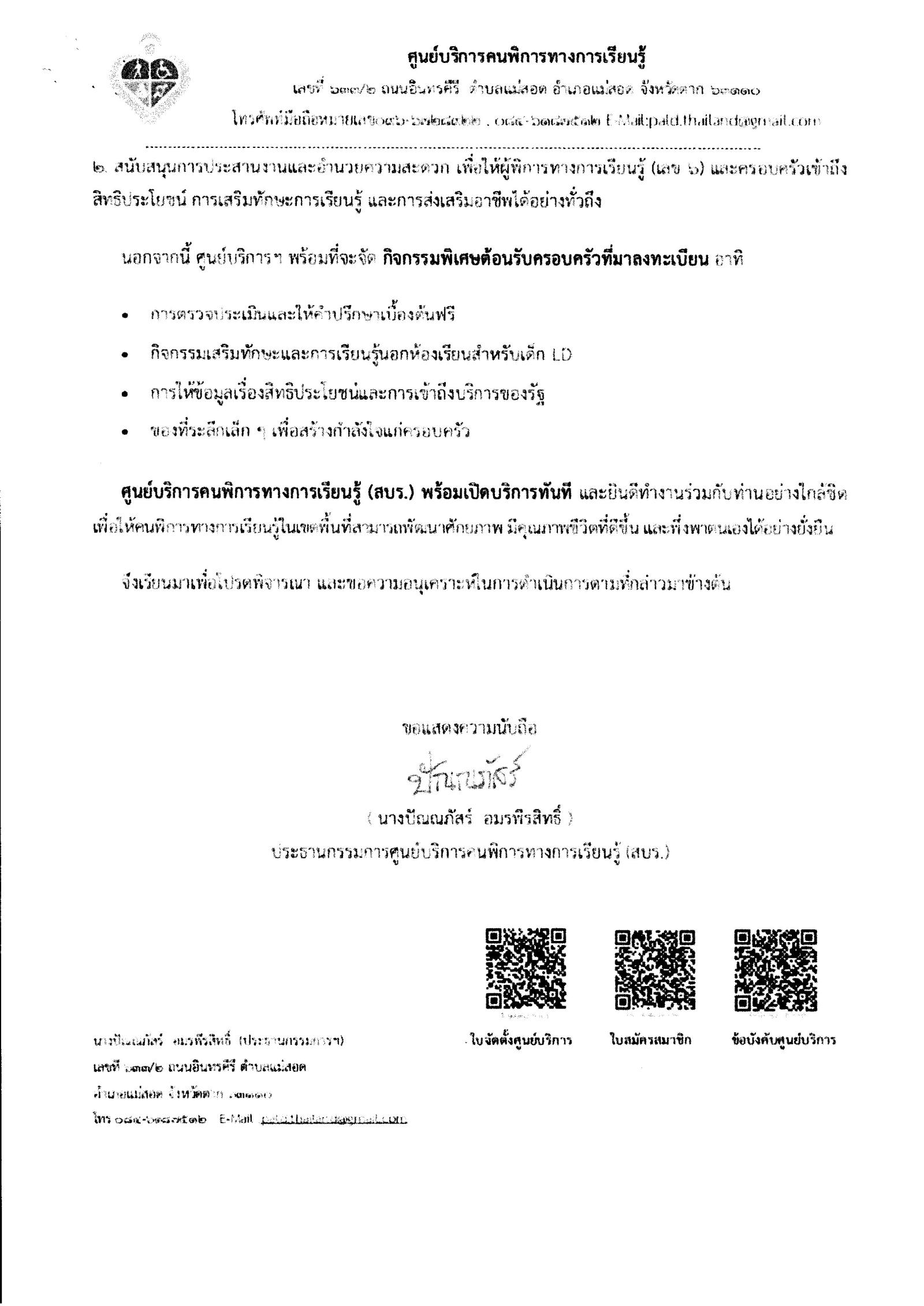 ด้วยเทศบาลนครแม่สอด ฝ่ายสังคมสงเคราะห์ กองสวัสติการสังคม ขอประชาสัมพันธ์ศูนย์บริการคนพิการทางการเรียนรู้ (สบร.) ให้กับครอบครัวคนพิการทางการเรียนรู้ ประเภท 6 ในการขอรับบริการ เพื่อเป็นการให้บริการข้อมูลข่าวสารด้านสิทธิประโยชน์ การช่วยเหลือด้านการดำเนินชีวิตและอาชีพ ฟื้นฟูสมรรถภาพการจัดกิจกรรมเสริมทักษะการเรียนรู้ เทคนิคการดูแล ส่งเสริมและพัฒนาศักยภาพของคนพิการตามความเหมาะสม รวมถึงการปรับกิจกรรมทางการเรียนรู้ให้สอดคล้องกับศักยภาพและความเหมาะสมของคนพิการ เพื่อให้เกิดการเรียนรู้ได้อย่างมีคุณภาพ รวมถึงครอบครัวผู้ดูแลคนพิการจะได้รับข้อมูล ความรู้และแนวทางในการดูแล ได้อย่างถูกต้อง อีกทั้งยังสามารถสมัครเป็นสมาชิกของศูนย์ ฯ ซึ่งจะได้รับบริการและสิทธิประโยชน์ได้อย่างทั่วถึง อีกทั้งขอเชิญชวนผู้ปกครองของผู้ที่มีบัตรประจำตัวคนพิการทางการเรีนรู้ประเภท 6 ที่ได้รับการคัดกรองทางการศึกษาว่ามีความบกพร่องทางการเรียนรู้ ให้เข้ามาใช้บริการที่ศูนย์บริการ โดยไม่เสียค่าใช้จ่ายแต่อย่างใด อ่านและดาวน์โหลดรายละเอียดเพิ่มเติมได้ตามเอกสารที่แนบมาด้านล่างนี้