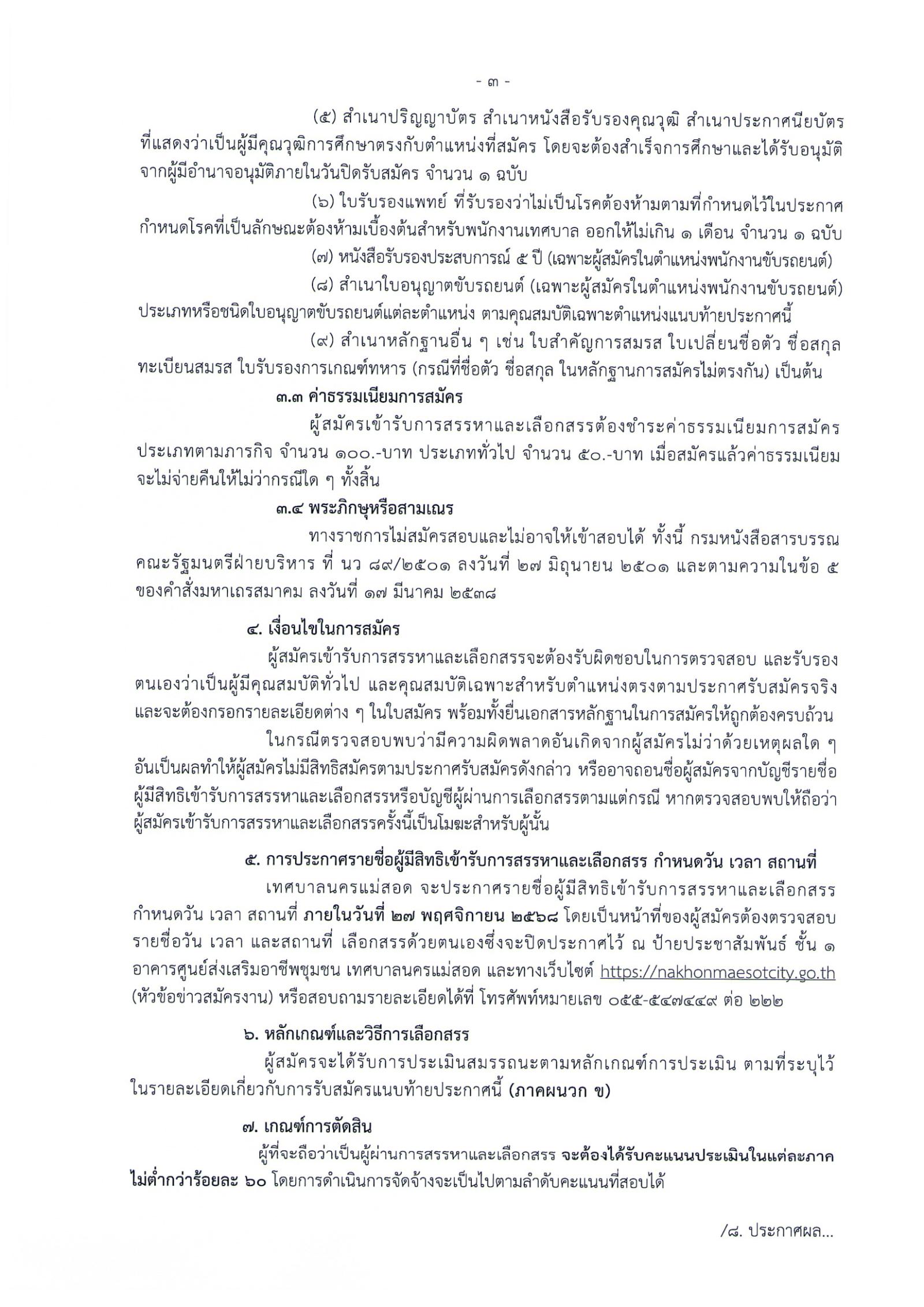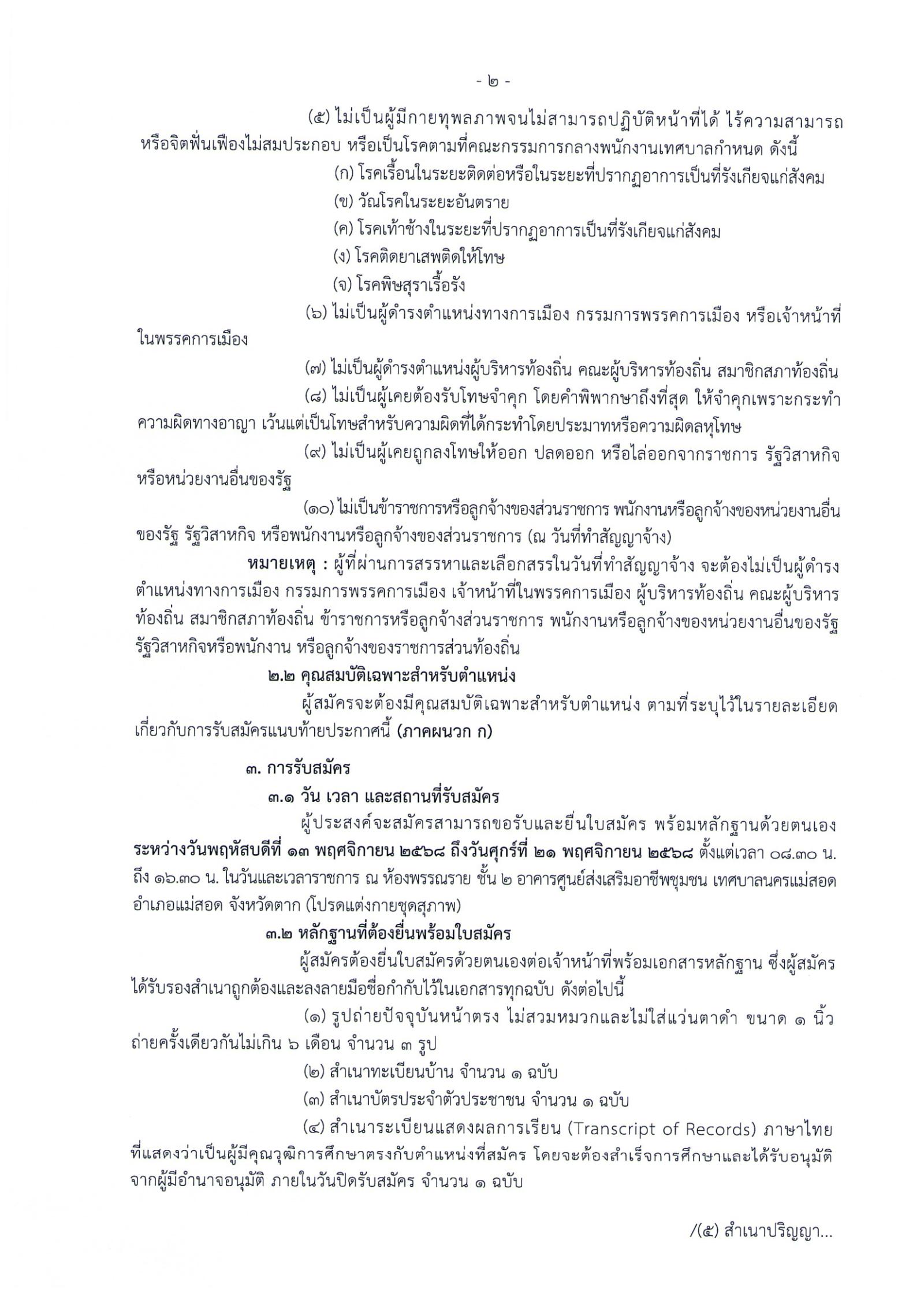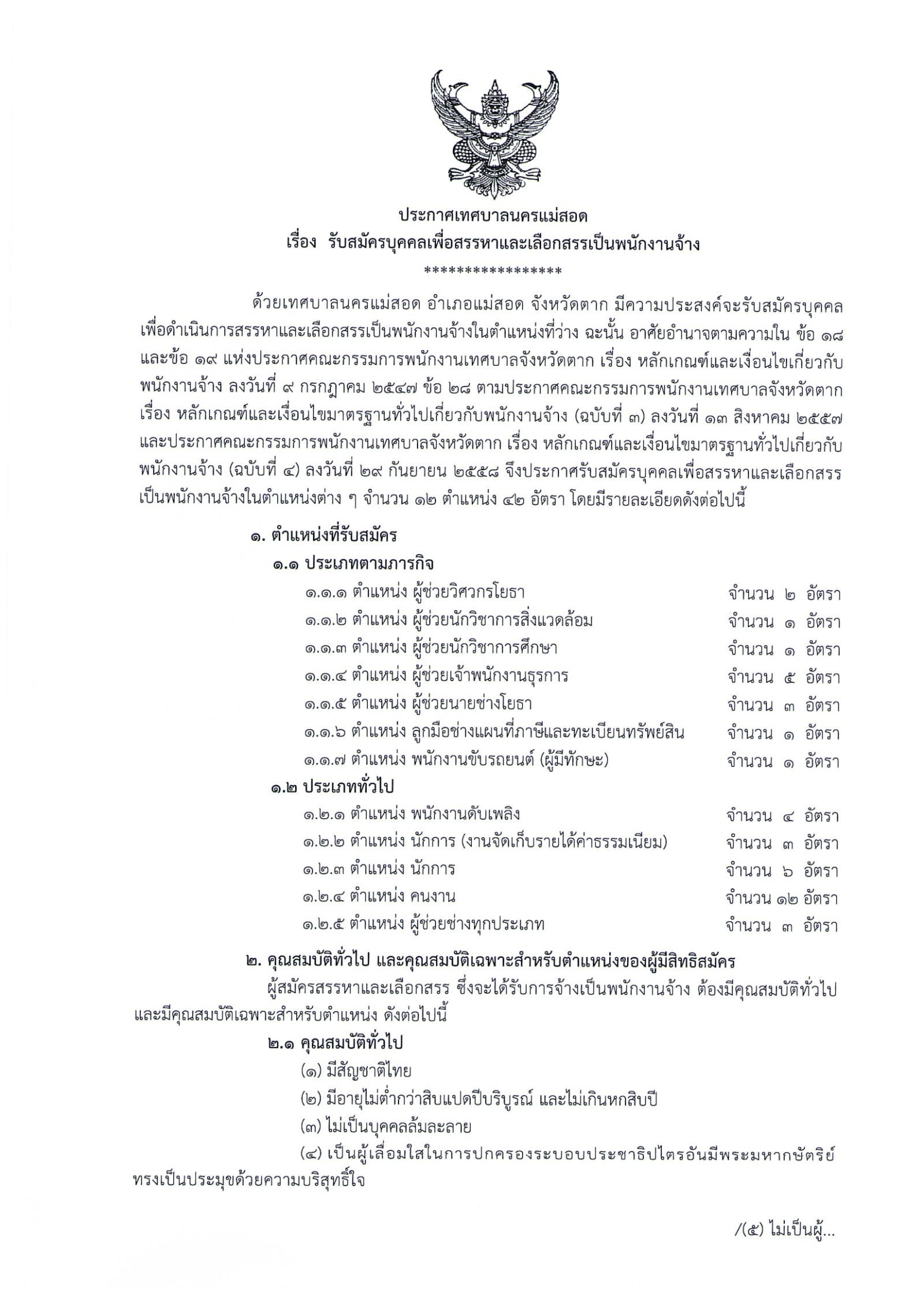 ด้วยเทศบาลนครแม่สอด อำเภอแม่สอด จังหวัดตาก มีความประสงค์จะรับสมัครบุคคลเพื่อดำเนินการสรรหาและเลือกสรรเป็นพนักงานจ้างในตำแหน่งที่ว่าง ฉะนั้นนั้น อาศัยอำนาจตามความใน ข้อ 18 และข้อ 19 แห่งประกาศคณะกรรมการพนักงานเทศบาลจังหวัดตาก เรื่อง หลักเกณฑ์และเงื่อนไขเกี่ยวกับพนักงานจ้าง ลงวันที่ 9 กรกฎาคม 2547 ข้อ 28 ตามประกาศคณะกรรมการพนักงานเทศบาลจังหวัดตาก เรื่อง หลักเกณฑ์และเงื่อนไขมาตรฐานทั่วไปเกี่ยวกับพนักงานจ้าง (ฉบับที่ 3) ลงวันที่ 13 สิงหาคม 2557 และประกาศคณะกรรมการพนักงานเทศบาลจังหวัดตาก เรื่อง หลักเกณฑ์และเงื่อนไขมาตรฐานทั่วไปเกี่ยวกับ พนักงานจ้าง (ฉบับที่ 4) ลงวันที่ 29 กันยายน 2558 จึงประกาศรับสมัครบุคคลเพื่อสรรรหาและเลือกสรรเป็นพนักงานจ้างในตำแหน่งต่าง ๆ จำนวน 12 ตำแหน่ง 42 อัตรา โดยมีรายละเอียดดังต่อไปนี้