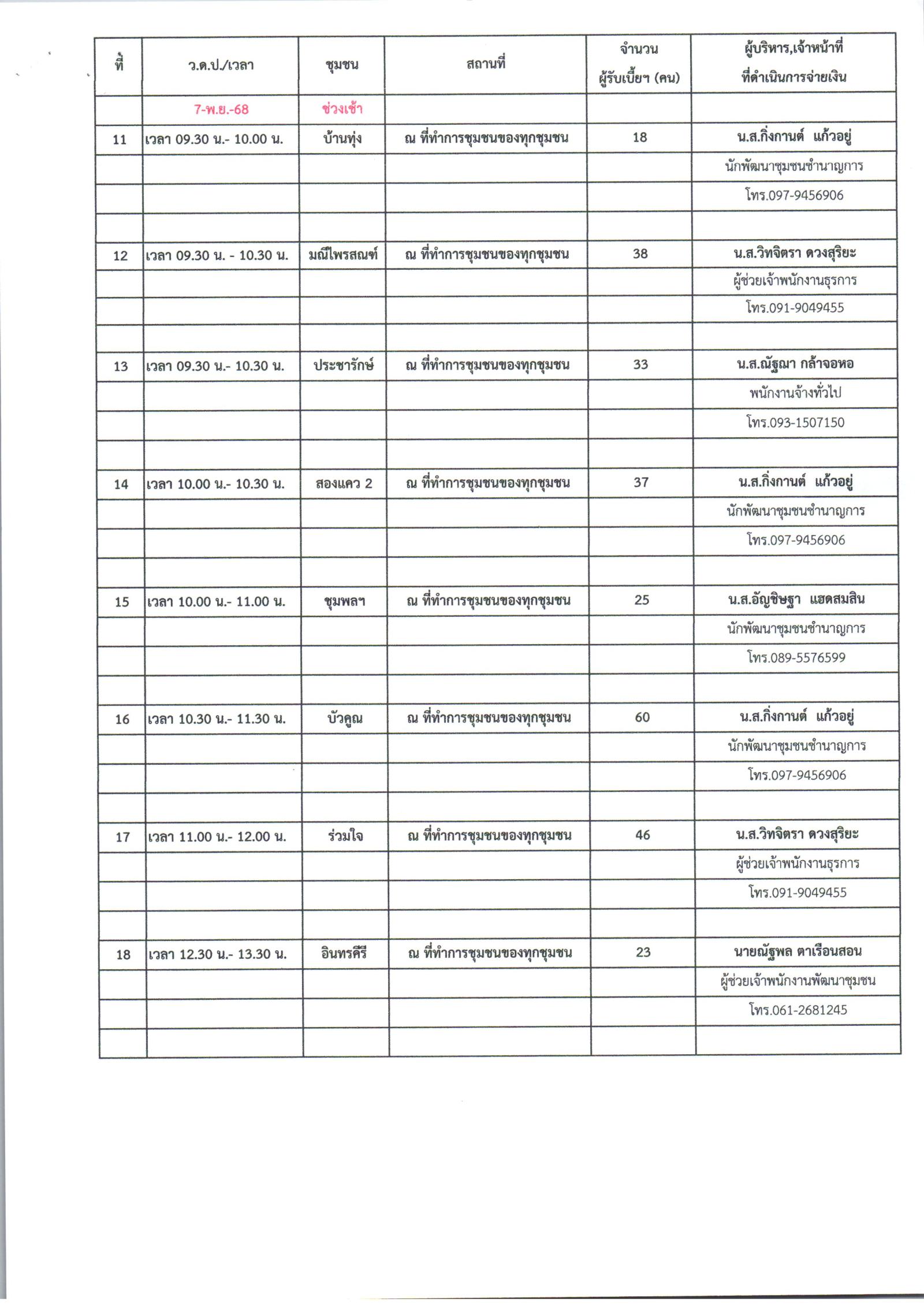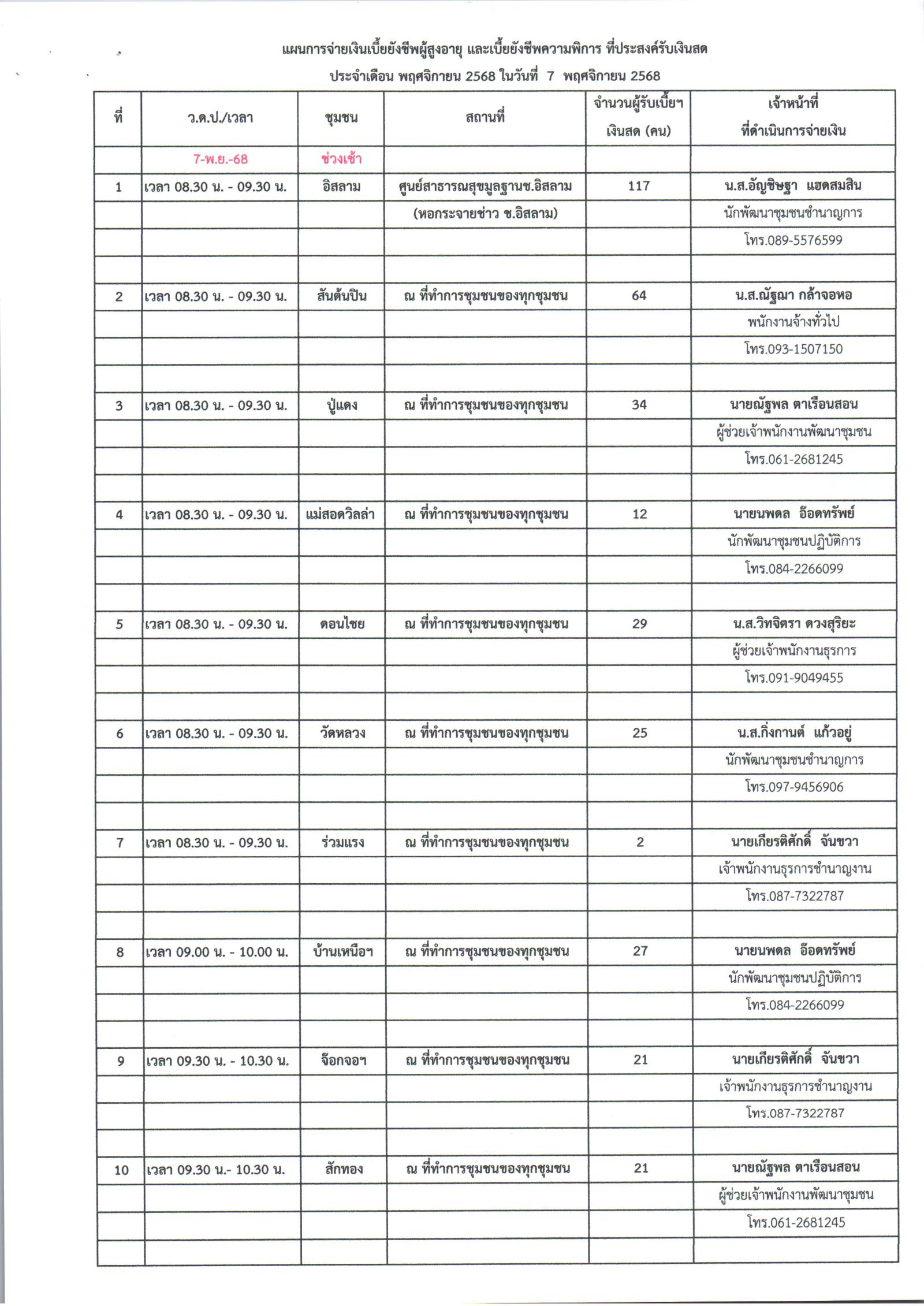 ด้วยกองสวัสดิการสังคม จะดำเนินการจ่ายเงินเบี้ยยังชีพผู้สูงอายุและเบี้ยความพิการประจำเดือนพฤศจิกายน 2568 ในวันศุกร์ ที่ 7 พฤศจิกายน 2568 ณ ที่ทำการชุมชนแต่ละชุมชน