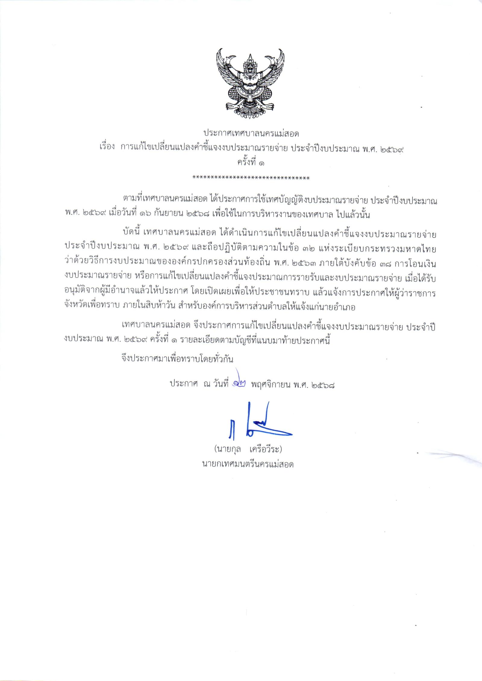 ประกาศเทศบาลนครแม่สอด เรื่อง การแก้ไขเปลี่ยนแปลงคำชี้แจงงบประมาณรายจ่าย ประจำปีงบประมาณ พ.ศ.2569 ครั้งที่ 1