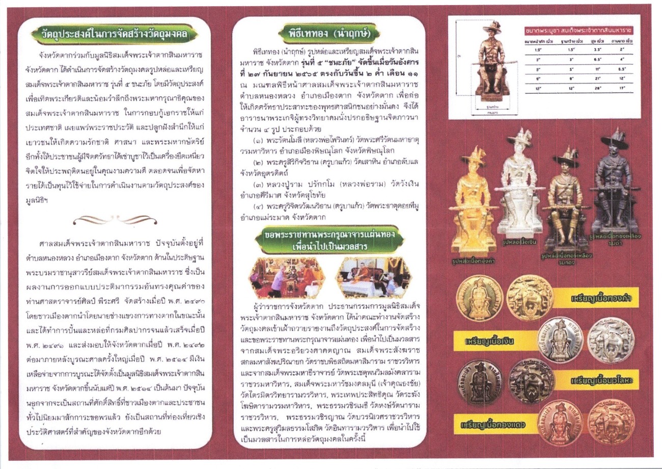 ด้วยจังหวัดตากร่วมกับมูลนิธิสมเด็จพระเจ้าตากสินมหาราช จังหวัดตาก ได้ดำเนินการจัดสร้างวัตถุมงคลรูปหล่อและเหรียญสมเด็จพระเจ้าตากสินมหาราช รุ่นที่ 5 ชนะภัย และผ้ายันต์ โดยมีวัตถุประสงค์ เพื่อเทิดพระเกียรติและน้อมรำลึกถึงพระมหากรุณารุณาธิคุณของสมเด็จพระเจ้าตากสินมหาราช ในการกอบกู้เอกราชให้แก่ประเทศชาติ เผยแพร่พระราชประวัติ และปลูกฝังสำนึกให้แก่เยาวชนให้เกิดความรักชาติ ศาสนา และพระมหากษัตริย์ อีกทั้งให้ประชาชนผู้มีจิตศรัทธาได้เข่าบูชาไว้เป็นเครื่องยึดเหนี่ยวจิตใจให้ประพฤติตนอยู่ในคุณงามความดี ตลอดจนเพื่อจัดหารายได้เป็นหนไว้ใช้จ่ายในการดำเนินงานตามวัตถุประสงค์ของของมูลนิธิฯซึ่งได้ประกอบพิธีเทวาภิเษกวัตถุมงคล เมื่อวันจันทร์ที่ 17 เมษายน 2566 เพื่อเปิดโอกาสให้ประชาชนได้เช่าบูชาวัตถุมงคลข้างต้นไว้บูชา หรือมอบเป็นของที่ระลึกเนื่องในโอกาสสำคัญต่าง ๆ มูลนิธิสมเด็จพระเจ้าตากสินมหาราช จังหวัดตาก จึงขอประชาสัมพันธ์ ให้ข้าราชการ พนักงาน ลูกจ้าง ตลอดจบประชาชนทั่วไปได้ทราบทั่วกัน ทั้งนี้ สามารถสังจองได้ ณ มูลนิธิสมเด็จพระเจ้าตากสินมหาราช จังหวัดตาก โทร 055-516121