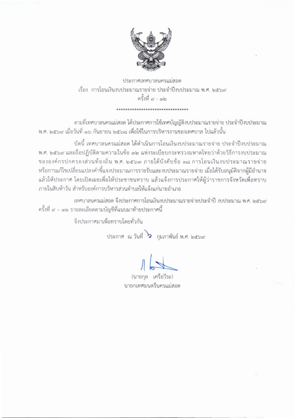 ประกาศเทศบาลนครแม่สอด เรื่อง การโอนเงินงบประมาณรายจ่าย ประจำปีงบประมาณ พ.ศ.2569 ครั้งที่ 9-12