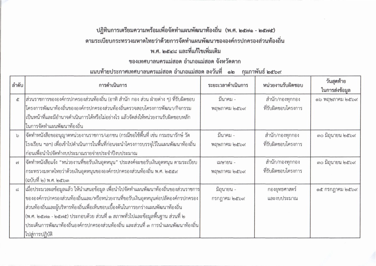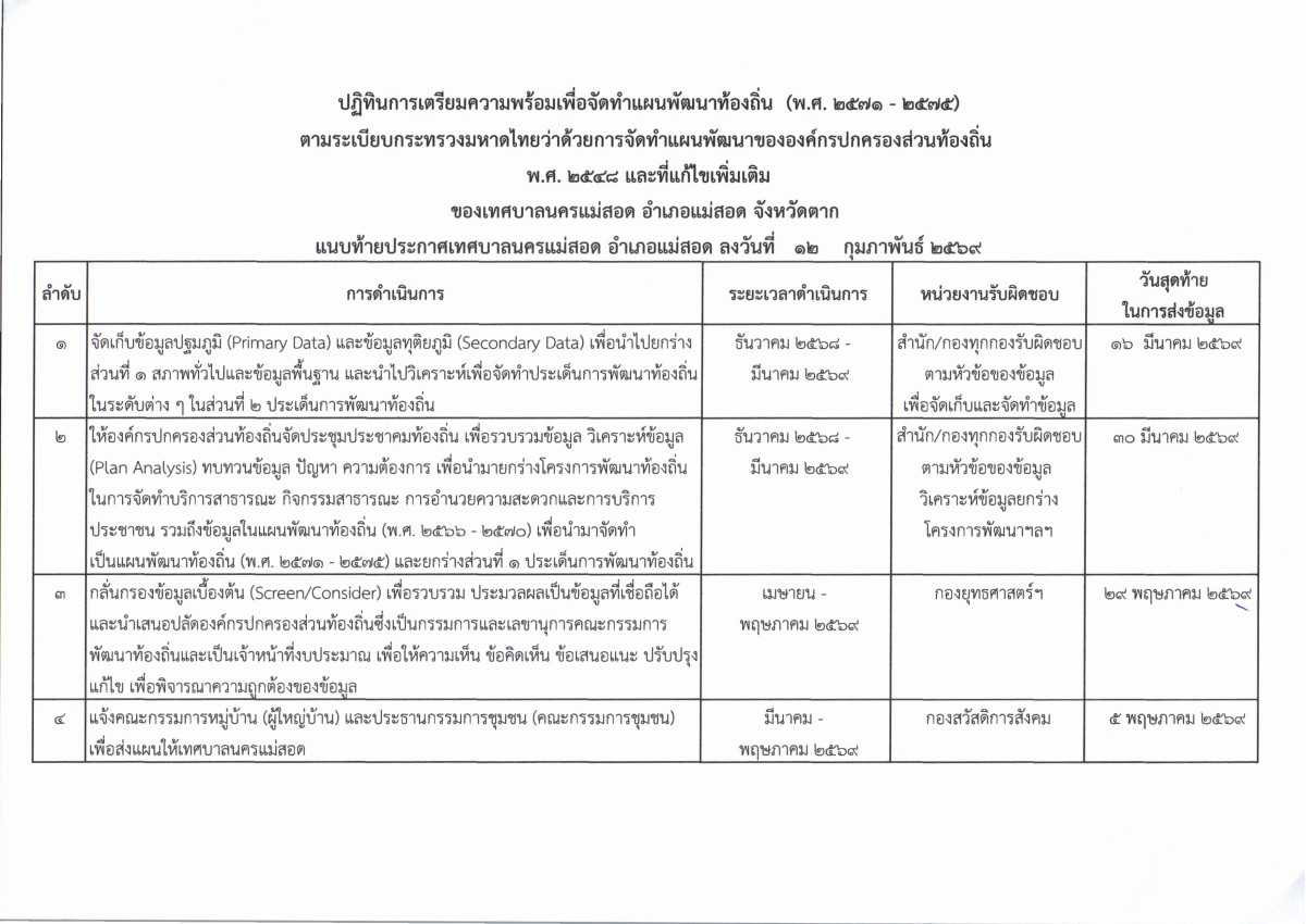 ประกาศเทศบาลนครแม่สอด เรื่อง ปฏิทินการเตรียมความพร้อมเพื่อจัดทำแผนพัฒนาท้องถิ่น (พ.ศ.2571-2575)