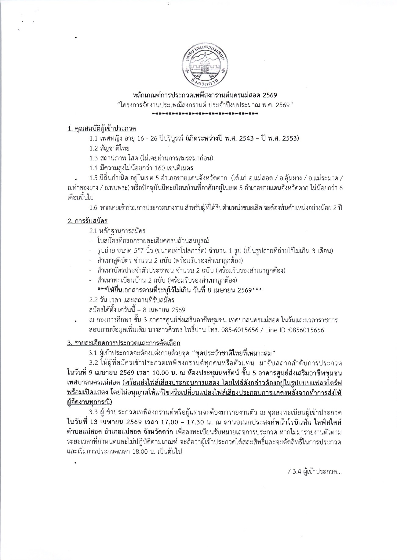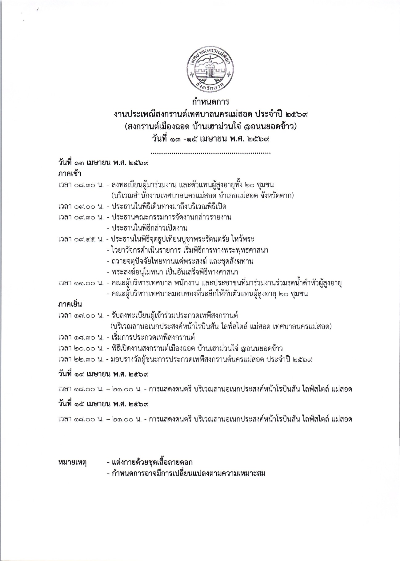 เทศบาลนครแม่สอด ขอประชาสัมพันธ์โครงการจัดงานประเพณีสงกรานต์ ประจำปีงบประมาณ พ.ศ. 2569 และโครงการจัดงานประเพณีขบวนแห่สืบสารวัฒนธรรมเมืองฉอด ประจำปีงบประมาณ พ.ศ.2569