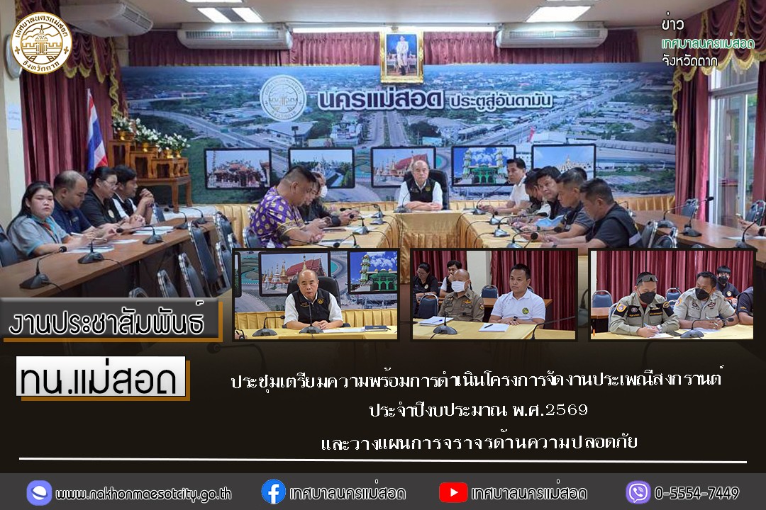 เมื่อวันอังคาร ที่ 7 เมษายน พ.ศ. 2569 เวลา 14.00 น. ณ ห้องประชุมโกเมน (ชั้น3) อาคารสำนักงานเทศบาลนครแม่สอด อำเภอแม่สอด จังหวัดตาก นายกุล เครือวีระ นายกเทศมนตรีนครแม่สอด มอบหมายให้ นายธีรรัตน์ ใจโปร่ง รองนายกเทศมนตรีนครแม่สอด พร้อมด้วย คณะผู้บริหาร ผู้อำนวยการกองการศึกษา เจ้าหน้าที่กองการศึกษา เจ้าหน้าที่ฝ่ายป้องกันและบรรเทาสาธารณภัย เจ้าหน้าที่เทศกิจ เทศบาลนครแม่สอด และเจ้าหน้าที่ที่เกี่ยวข้อง ประชุมเตรียมความพร้อมการดำเนินโครงการจัดงานประเพณีสงกรานต์ ประจำปีงบประมาณ พ.ศ.2569 และวางแผนการจราจรด้านความปลอดภัย ร่วมกับ สถานีตำรวจภูธรแม่สอด ฝ่ายปกครองอำเภอแม่สอด กองร้อยตำรวจตระเวนชายแดนที่ 346 และโรบินสัน ไลฟ์สไตล์ แม่สอด