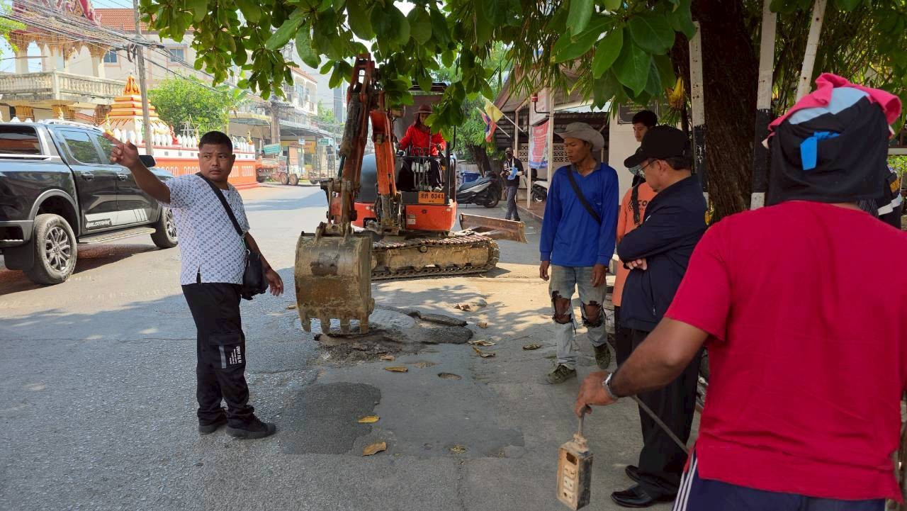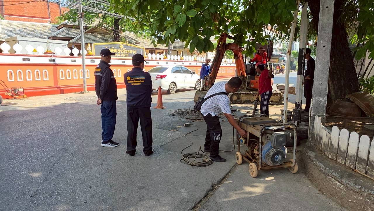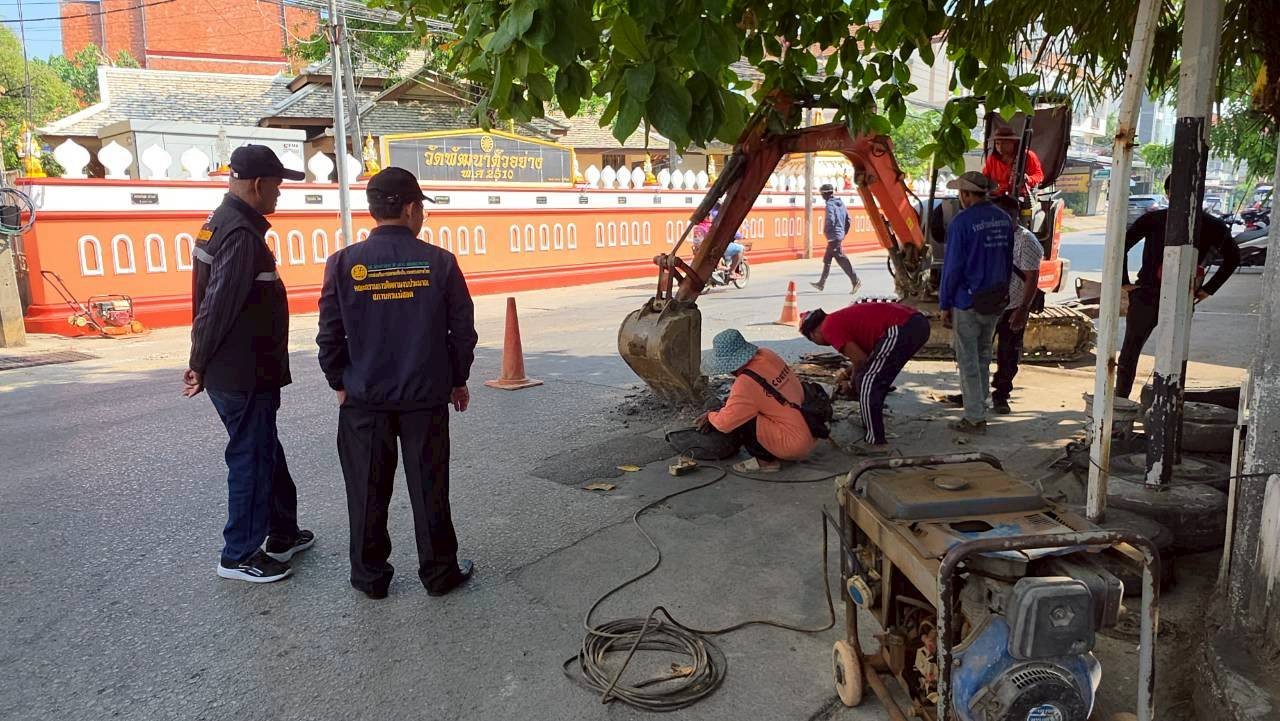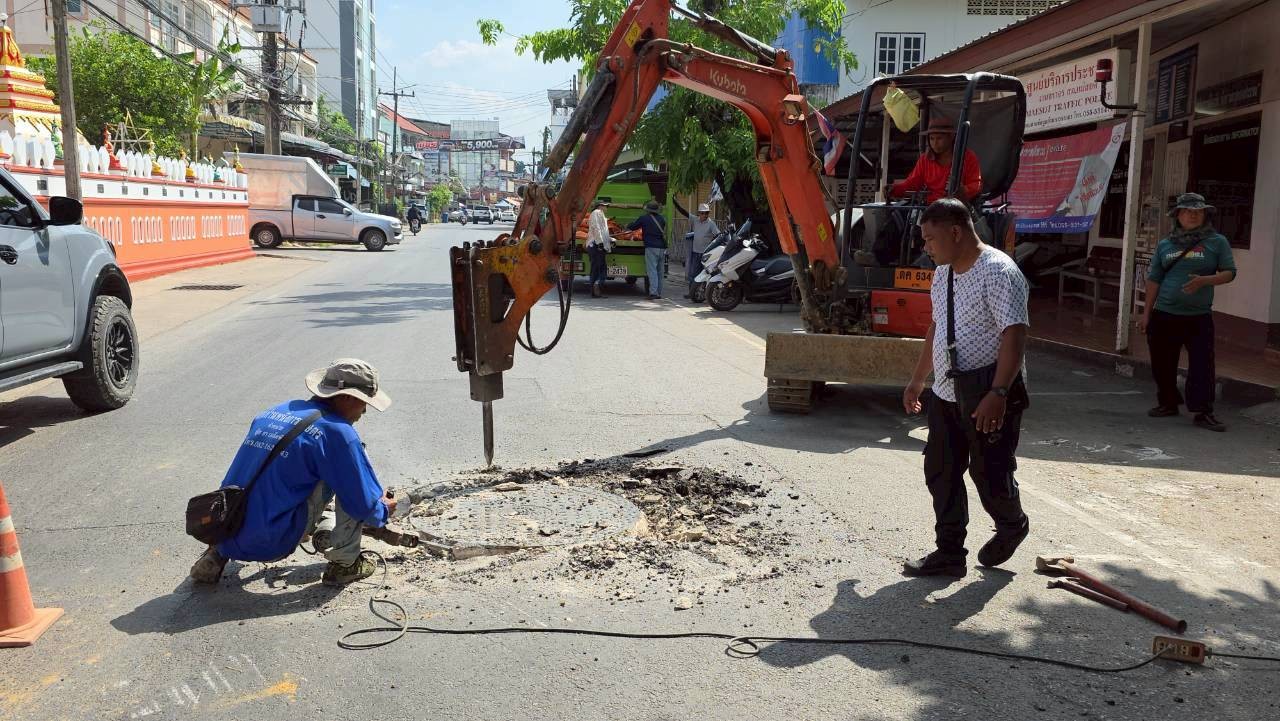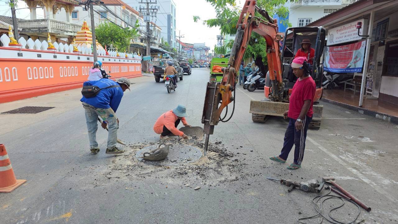 เทศบาลนครแม่สอด ลงพื้นที่ขุดปรับฝาท่อระบายน้ำหน้าวัดอรัญญเขต