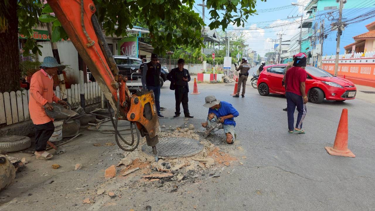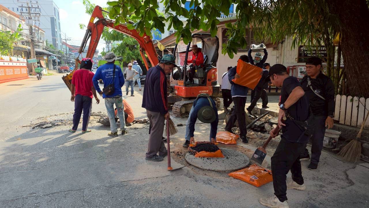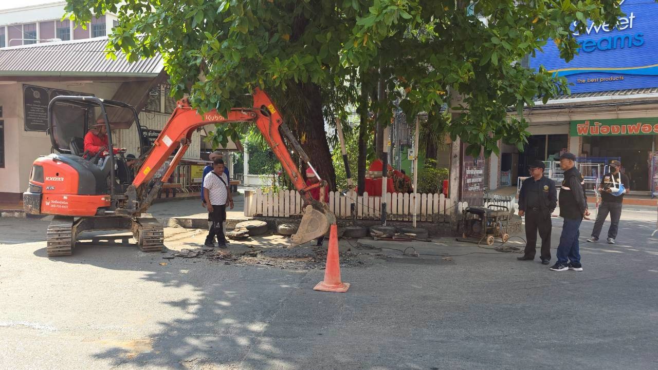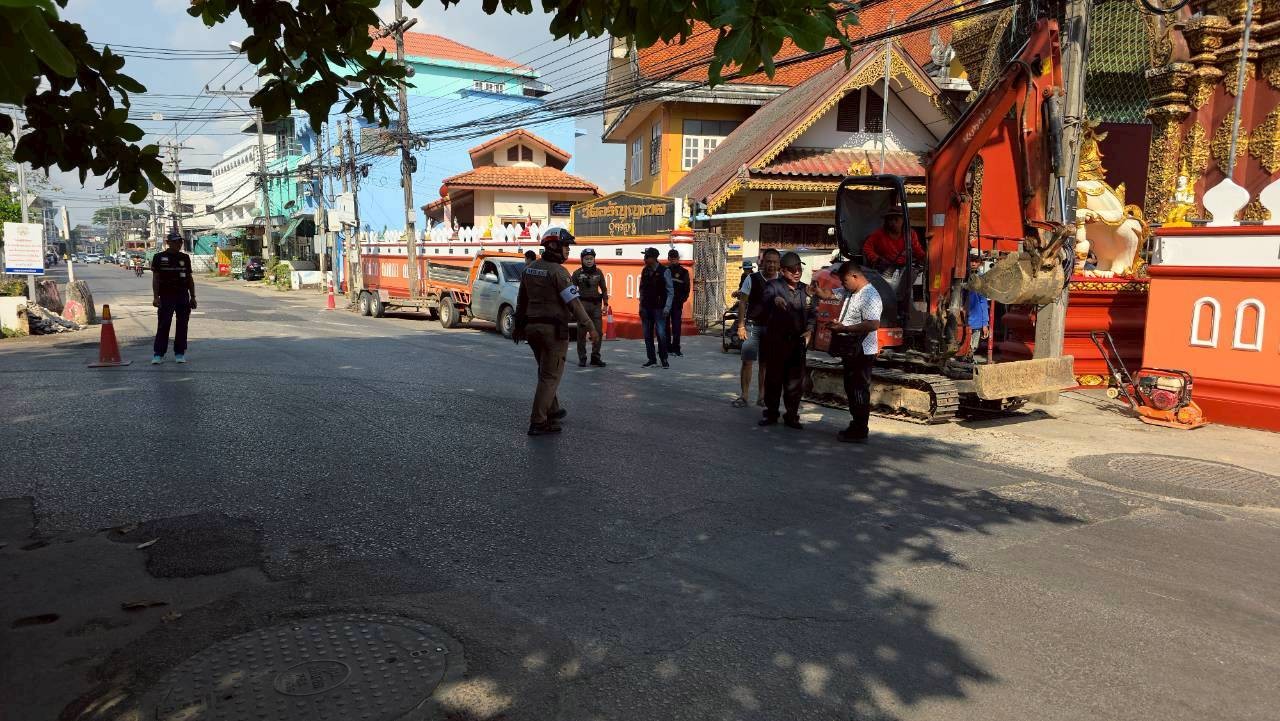 เทศบาลนครแม่สอด ลงพื้นที่ขุดปรับฝาท่อระบายน้ำหน้าวัดอรัญญเขต