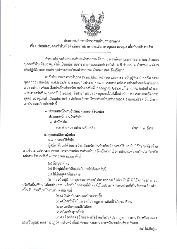 เทศบาลนครแม่สอด ขอประชาสัมพันธ์ประกาศองค์การบริหารส่วนตำบลท่าสายลวด เรื่อง รับสมัครบุคคลทั่วไปเพื่อดำเนินการสรรหาและเลือกสรรบุคคล บรรจุแต่งตั้งเป็นพนักงานจ้าง