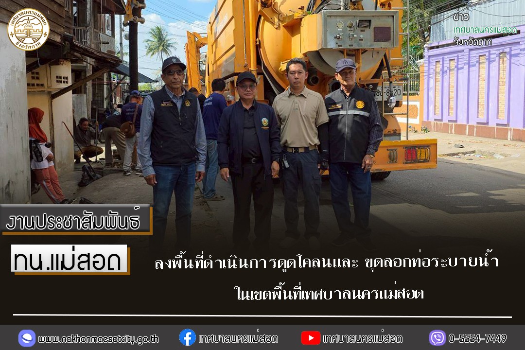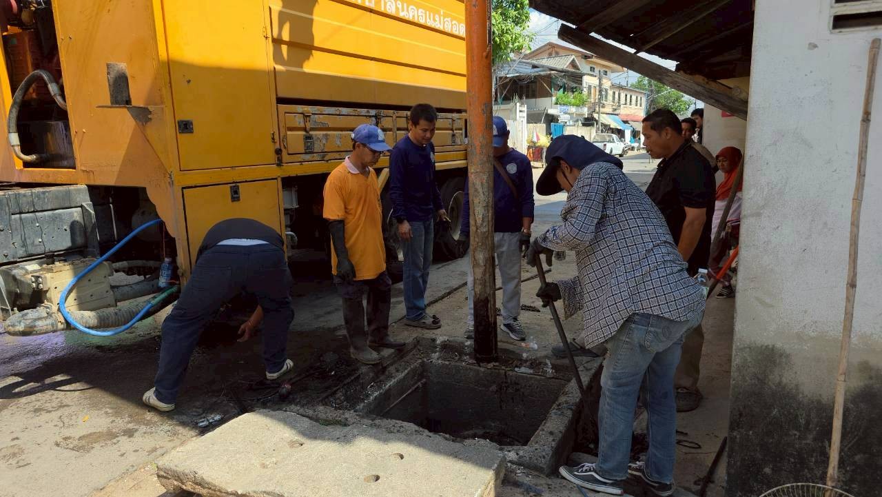 นายกุล เครือวีระ นายกเทศมนตรีนครแม่สอด มอบหมายให้ นายวสุธร บุญมาก รองนายก เทศมนตรีนครแม่สอด พร้อมด้วย สมาชิกสภาเทศบาลนครแม่สอด และเจ้าหน้าที่กองช่างสุขาภิบาล ลงพื้นที่ดำเนินการดูดโคลนและขุดลอกท่อระบายน้ำในเขตพื้นที่เทศบาลนครแม่สอด ชุมชนอิสลาม เพื่อให้การไหลของน้ำสามารถระบายได้อย่างสะดวก รวดเร็ว ป้องกันปัญหาน้ำท่วมขัง เทศบาลนครแม่สอดจึงขออภัยในความไม่สะดวกสำหรับประชาชนที่พักอาศัย และสัญจรไปมาในบริเวณดังกล่าว