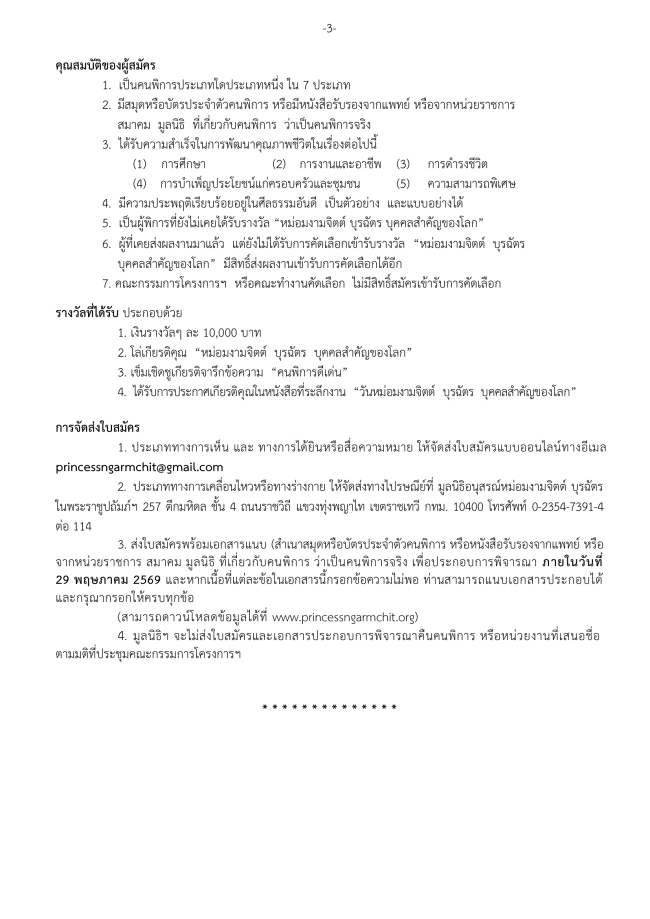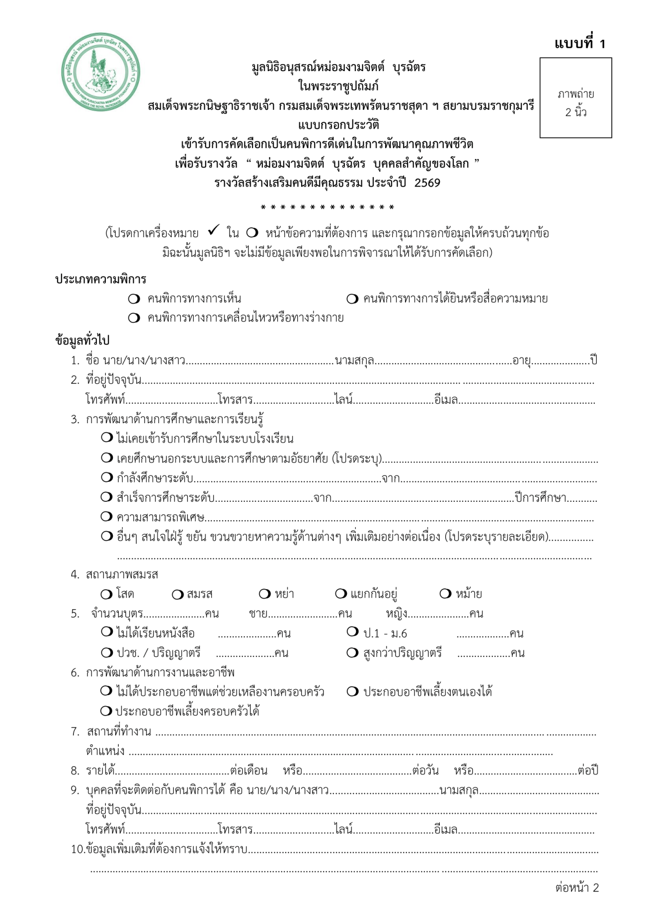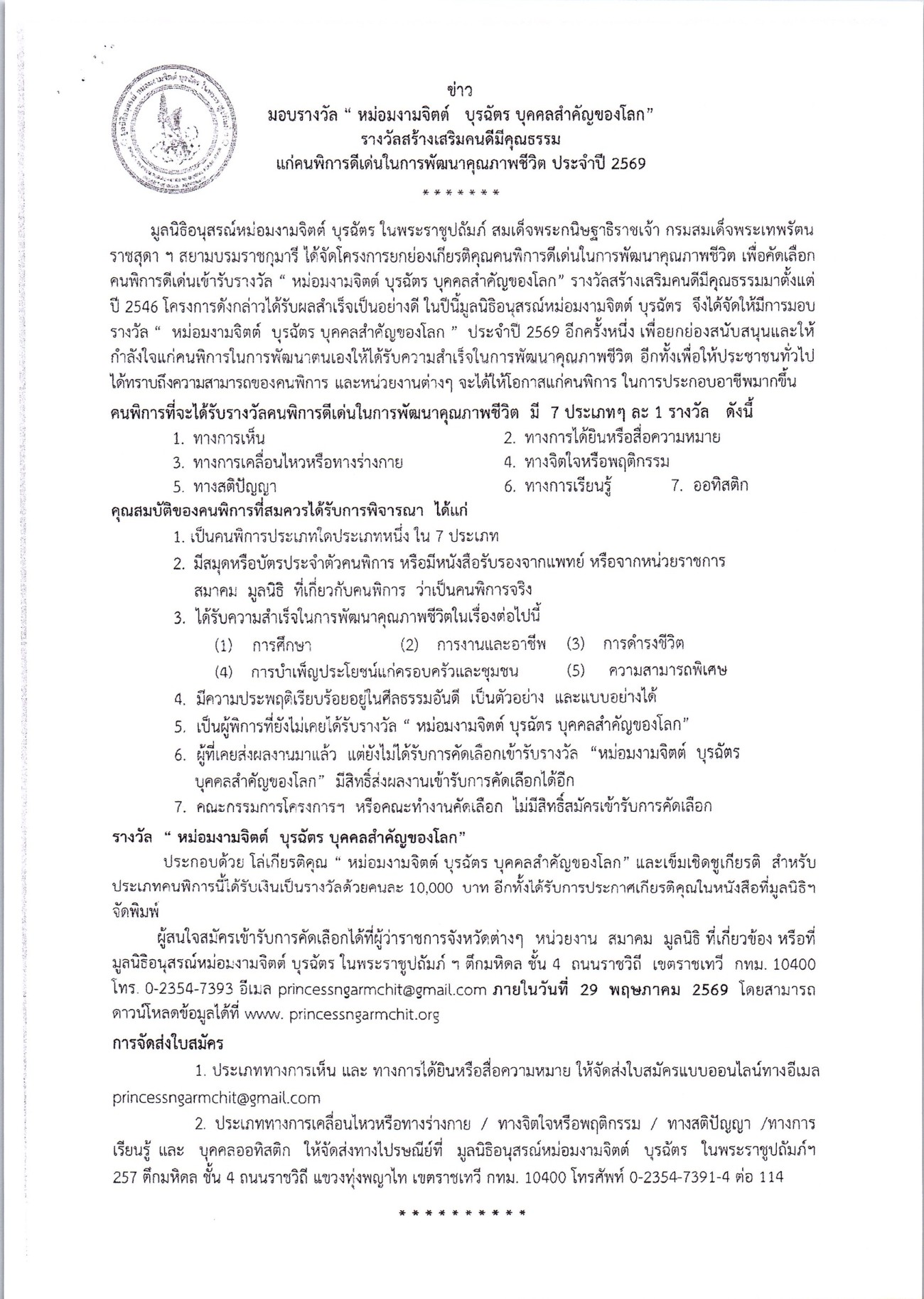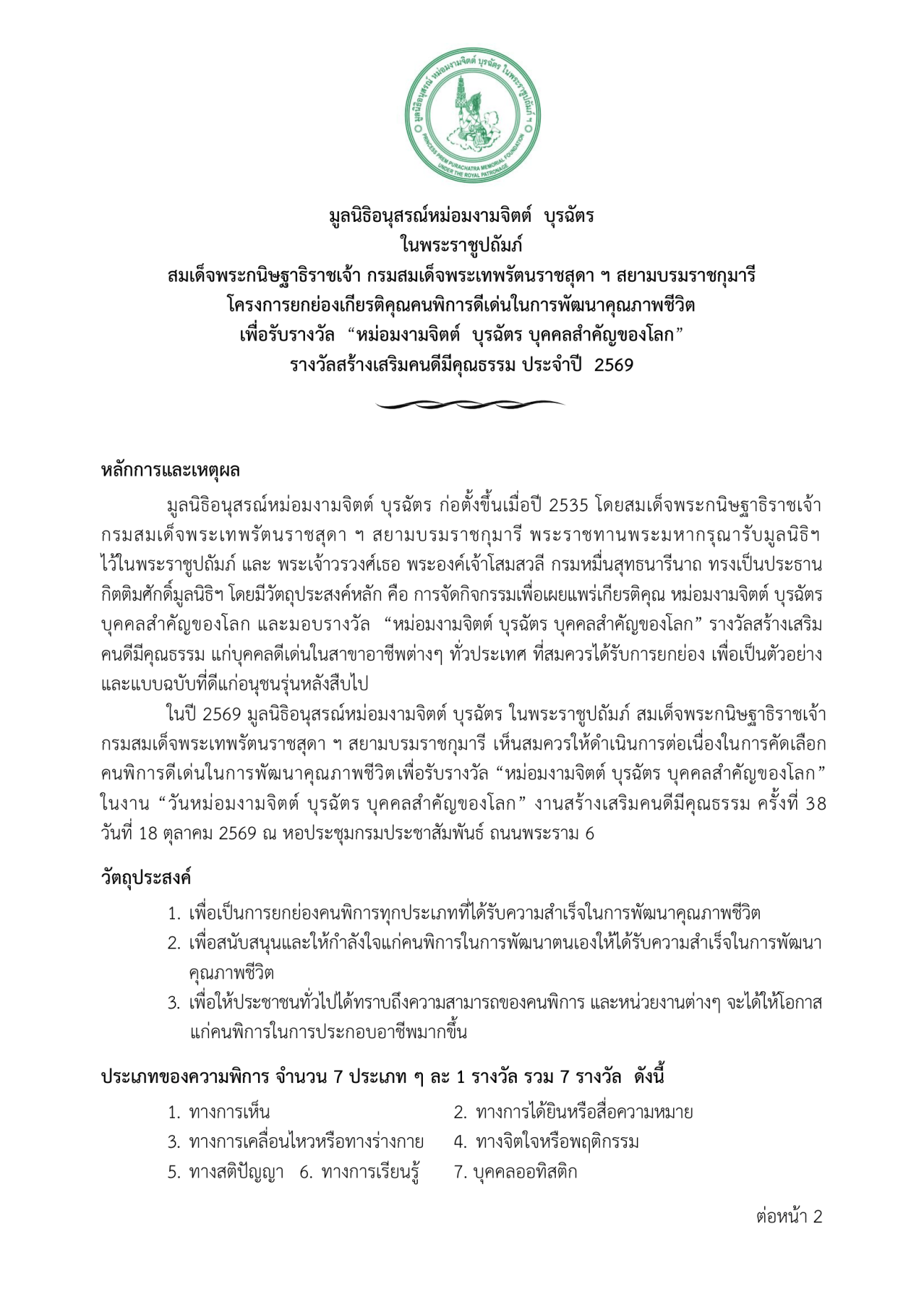 เทศบาลนครแม่สอด ขอประชาสัมพันธ์ประกาศรับสมัครคนพิการ เพื่อคัดเลือกเข้ารับรางวัล หม่อมงามจิตต์ บุรฉัตร บุคคลสำคัญของโลก ประจำปี 2569