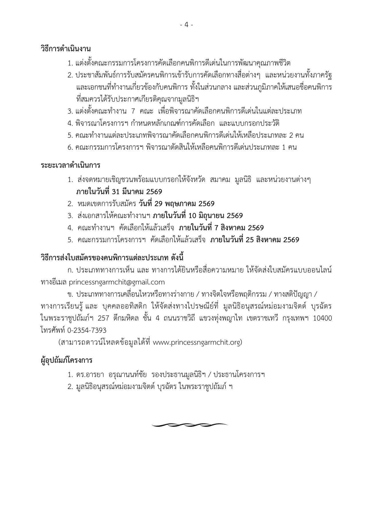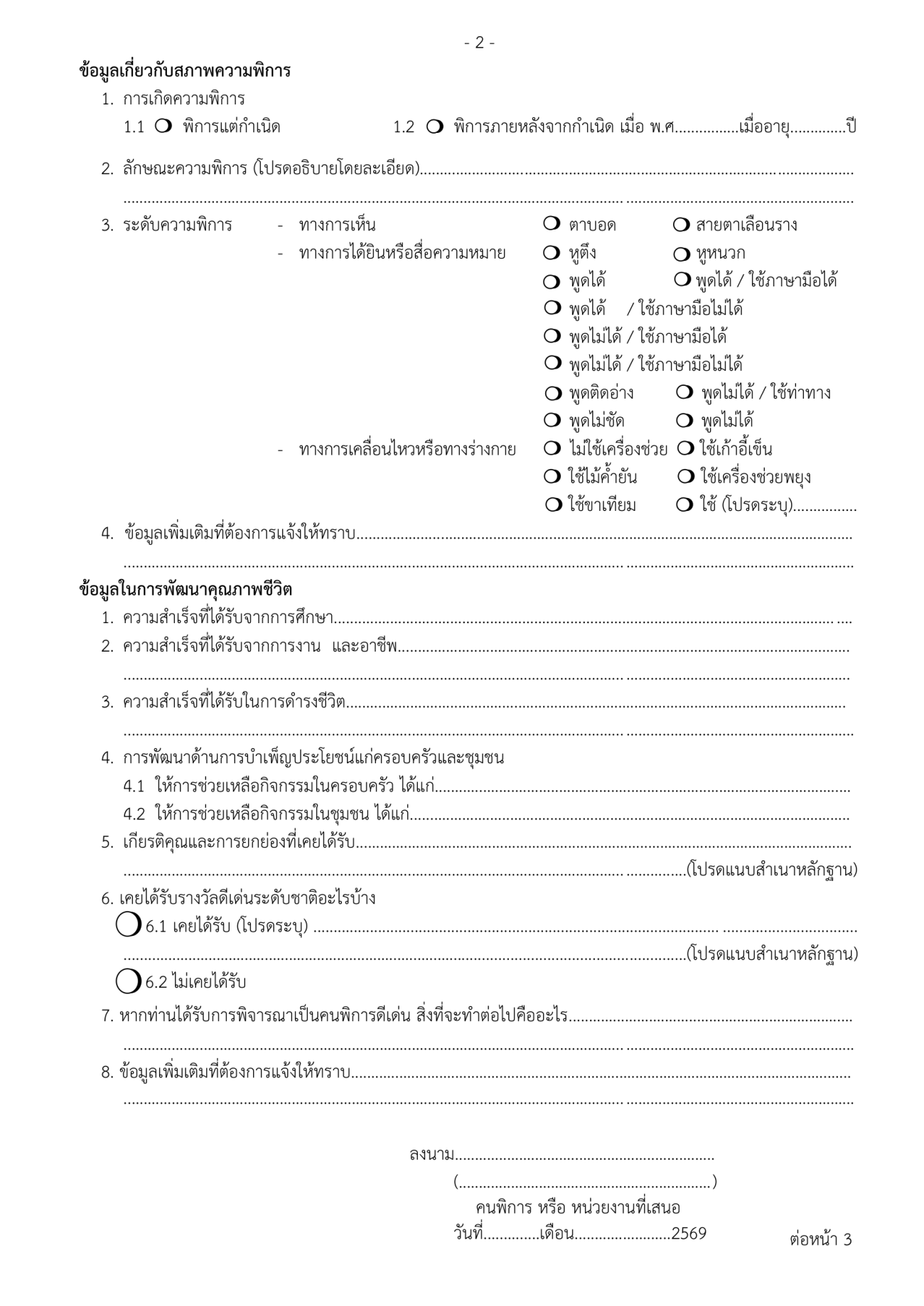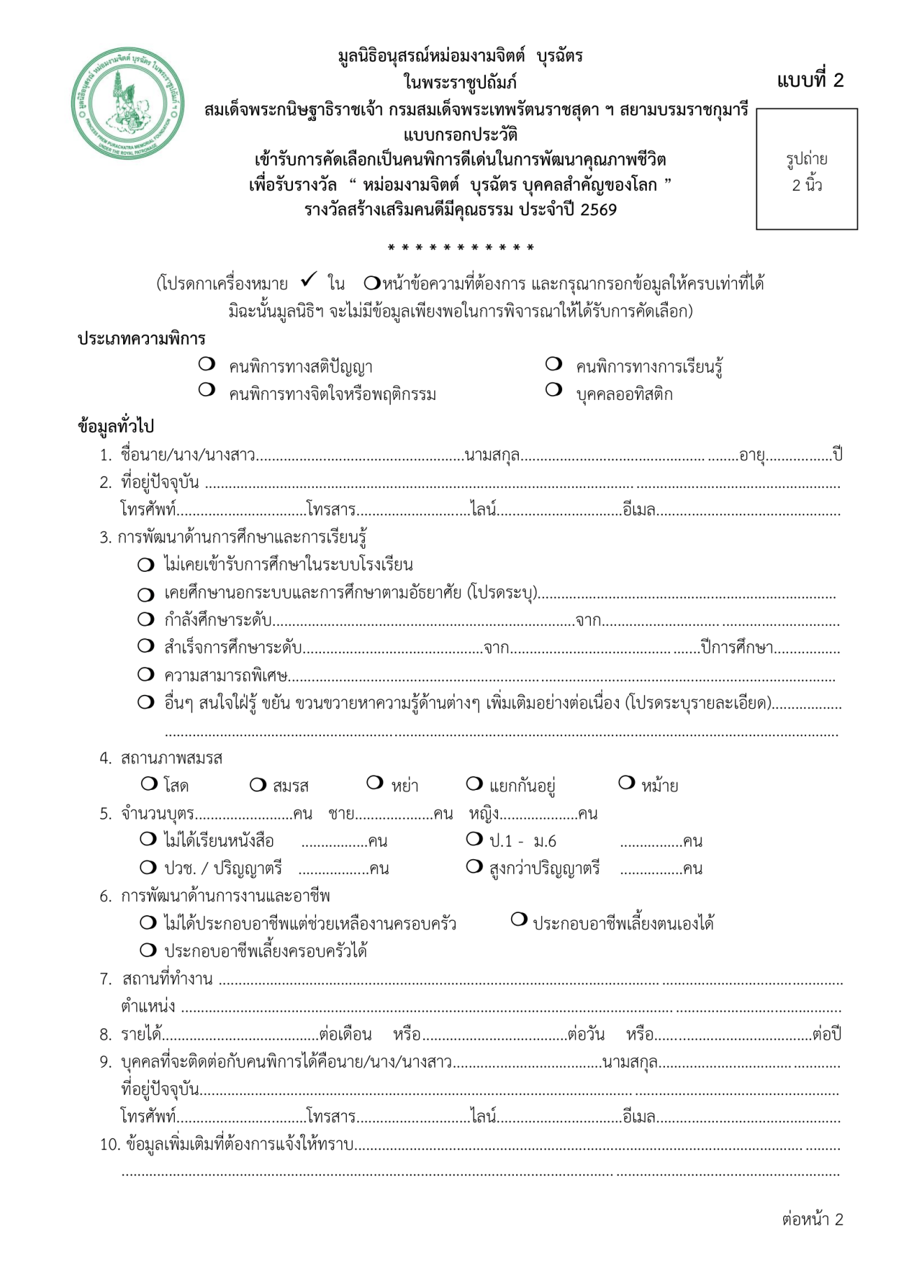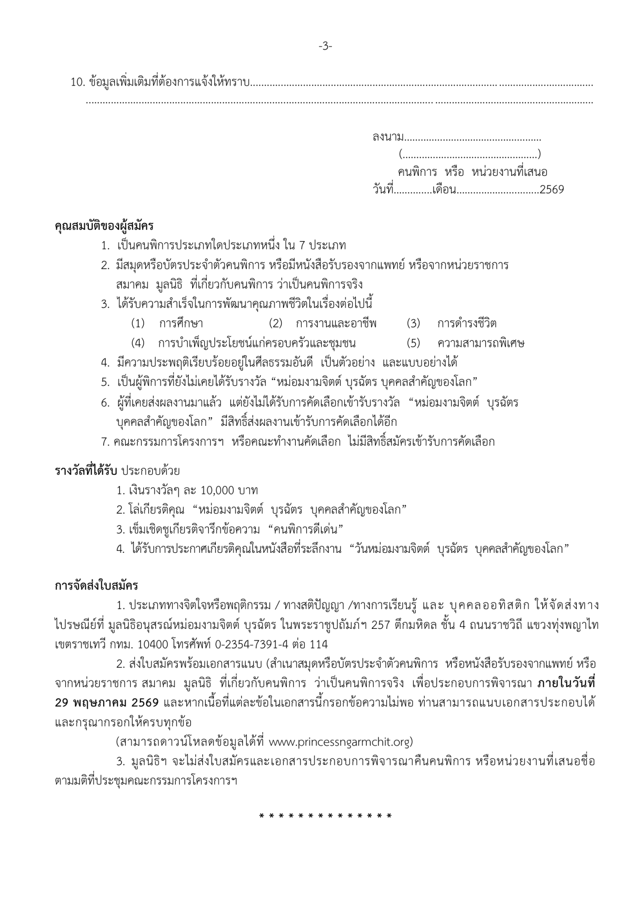 สามารถส่งแบบกรอกประวัติคนพิการเพื่อรับการพิจารณาขัดเลือกด้วยตัวเองไปยังศูนย์บริการคนพิการจังหวัดตาก เลขที่ 910 หมู่9 ตำบลน้ำรึม จังหวัดตาก ภายใน วันที่ 23 พ.ค. 2569 รายละเอียด ตามประกาศด้านล่างนี้