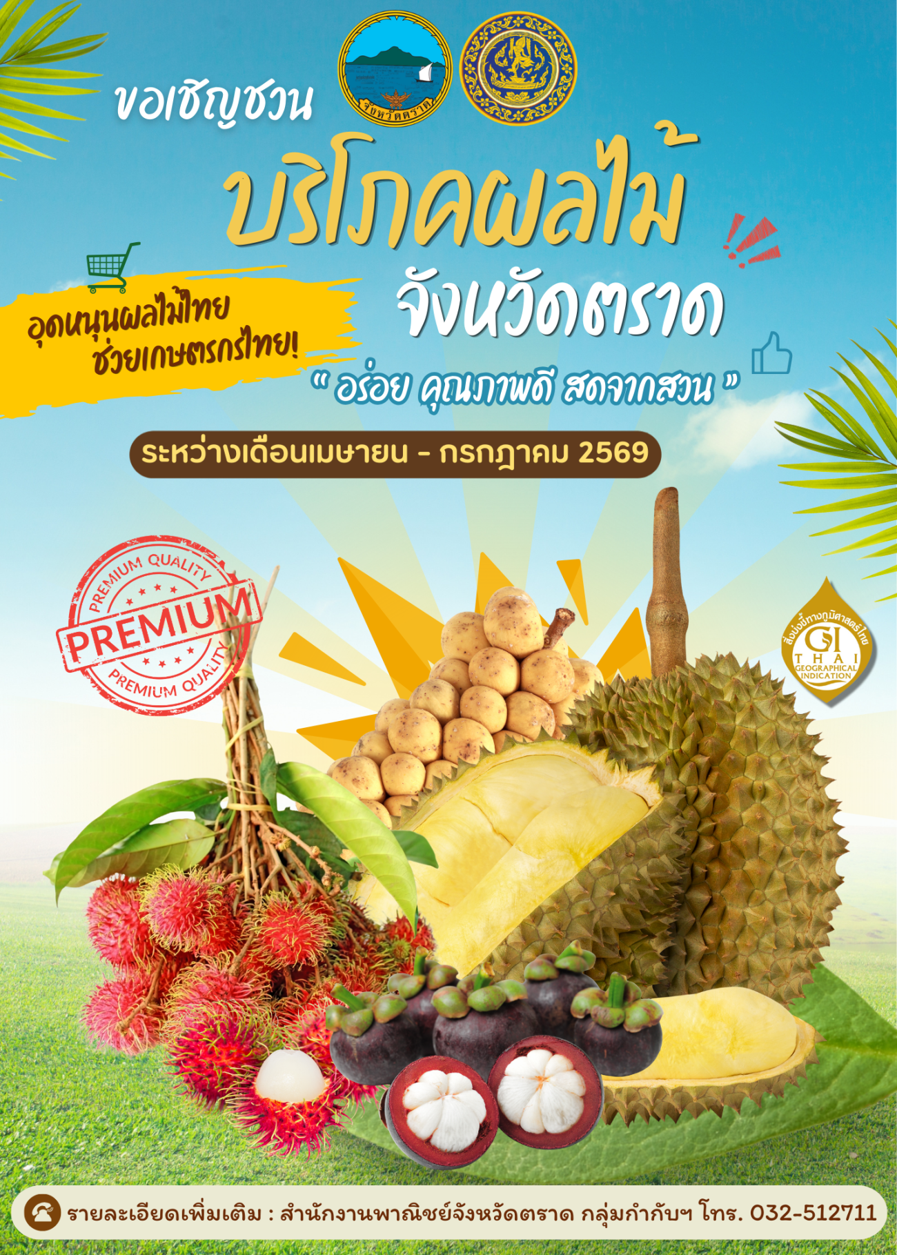 ด้วยสำนักงานพาณิชย์จังหวัดตราด ขอเชิญชวน บริโภคผลไม้จังหวัดตราด “อร่อย คุณภาพดี สดจากสวน”