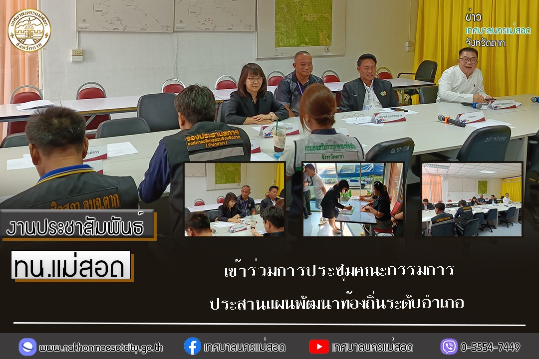 เมื่อวันอังคาร ที่ 28 เมษายน 2569 เวลา 09.00 น. ณ ห้องประชุมองค์การบริหารส่วนตำบลพะวอ อำเภอแม่สอด จังหวัดตาก นายกุล เครือวีระ นายกเทศมนตรีนครแม่สอด มอบหมายให้ นางสาวรุจิรา ภูมิผล นักวิเคราะห์นโยบายและแผนชำนาญการ กองยุทธศาสตร์และงบประมาณ พร้อมด้วย นายธานนท์ สีลา ผู้ช่วยนักวิเคราะห์นโยบายและแผน กองยุทธศาสตร์และงบประมาณ เข้าร่วมการประชุมคณะกรรมการประสานแผนพัฒนาท้องถิ่นระดับอำเภอ เพื่อให้การจัดทำแผนพัฒนาขององค์กรปกครองส่วนท้องถิ่นมีการประสานบูรณาการการจัดทำแผนพัฒนาในภาพรวมของอำเภอ ให้เกิดประสิทธิภาพและประสิทธิผล