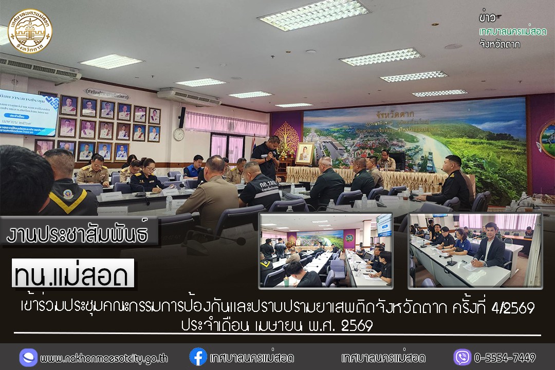 นายกุล เครือวีระ นายกเทศมนตรีนครแม่สอด มอบหมายให้ นายสยาม มั่นเมือง นักจัดการงานทั่วไปชำนาญการ กองยุทธศาสตร์และงบประมาณ เข้าร่วมประชุมคณะกรรมการป้องกันและปราบปรามยาเสพติดจังหวัดตาก ครั้งที่ 4/2569 ประจำเดือน เมษายน พ.ศ. 2569 โดยมี นายชูศักดิ์ รู้ยิ่ง ผู้ว่าราชการจังหวัดตาก เป็นประธานในการประชุม ฯ