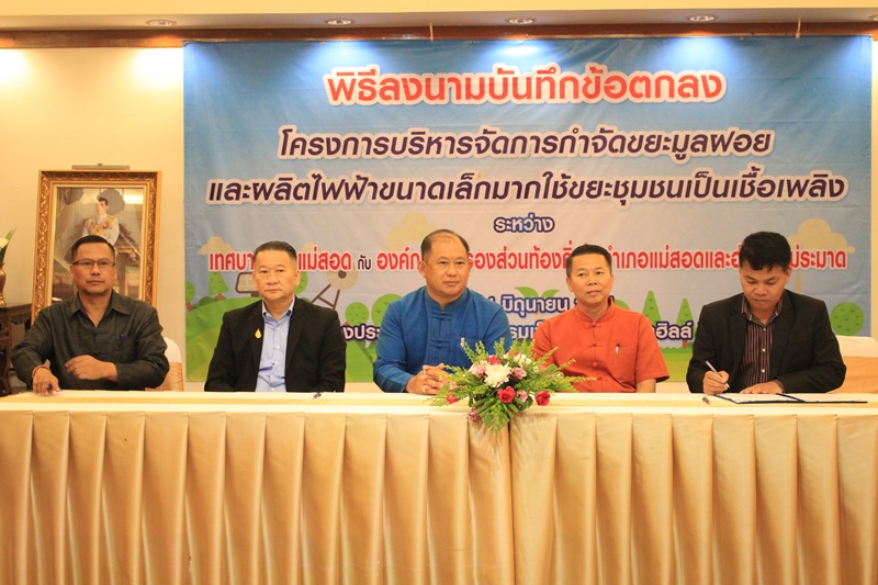 เมื่อวันพฤหัสบดี ที่ 14 มิถุนายน พ.ศ. 2561 เวลา 09.00 น. ณ ห้องประชุมบอลรูม โรงแรมเซ็นทาราแม่สอดฮิลล์รีสอร์ท อำเภอแม่สอด จังหวัดตาก ดร.เทอดเกียรติ ชินสรนันท์ นายกเทศมนตรีนครแม่สอด และนายชาตรี สุขารมย์ ปลัดเทศบาลนครแม่สอด ได้ลงนามบันทึกข้อตกลงโครงการบริหารจัดการกำจัดขยะมูลฝอยและผลิตไฟฟ้าขนาดเล็กมากใช้ขยะชุมชน เป็นเชื้อเพลิงกับองค์กรปกครองส่วนท้องถิ่น จำนวน 14 แห่งในอำเภอแม่สอด อำเภอแม่ระมาด และเรือนจำอำเภอแม่สอด โดยมี นายชัยพฤกติ์ เชียรธานรักษ์ นายอำเภอแม่สอดเป็นประธานในพิธีพร้อมด้วย รองนายกเทศมนตรีนครแม่สอด สมาชิกสภาเทศบาล หัวหน้าส่วนราชการ และผู้นำชุมชนร่วมพิธี พร้อมบรรยายสรุปแนวทางการแก้ไขปัญหาด้านต่างๆ ขององค์กรปกครองส่วนท้องถิ่นในเขตพัฒนาเศรษฐกิจพิเศษตาก รวมถึงการผลักดันกฎหมายที่จะนำมาปรับใช้กับเขตพัฒนาเศรษฐกิจพิเศษตากและการยกฐานะเทศบาลนครแม่สอดเป็นท้องถิ่นรูปแบบพิเศษเช่นเดียวกับเมืองพัทยา
