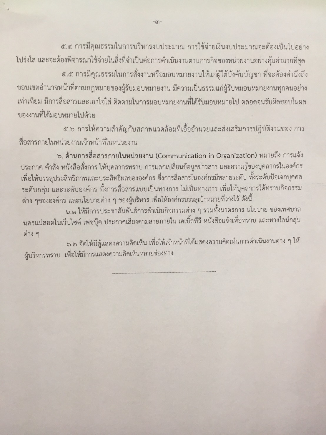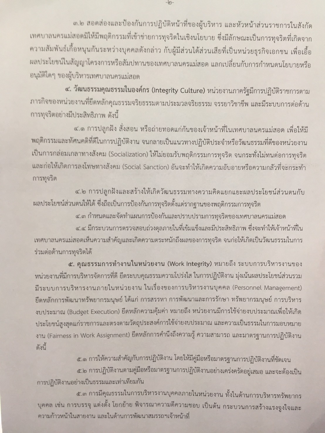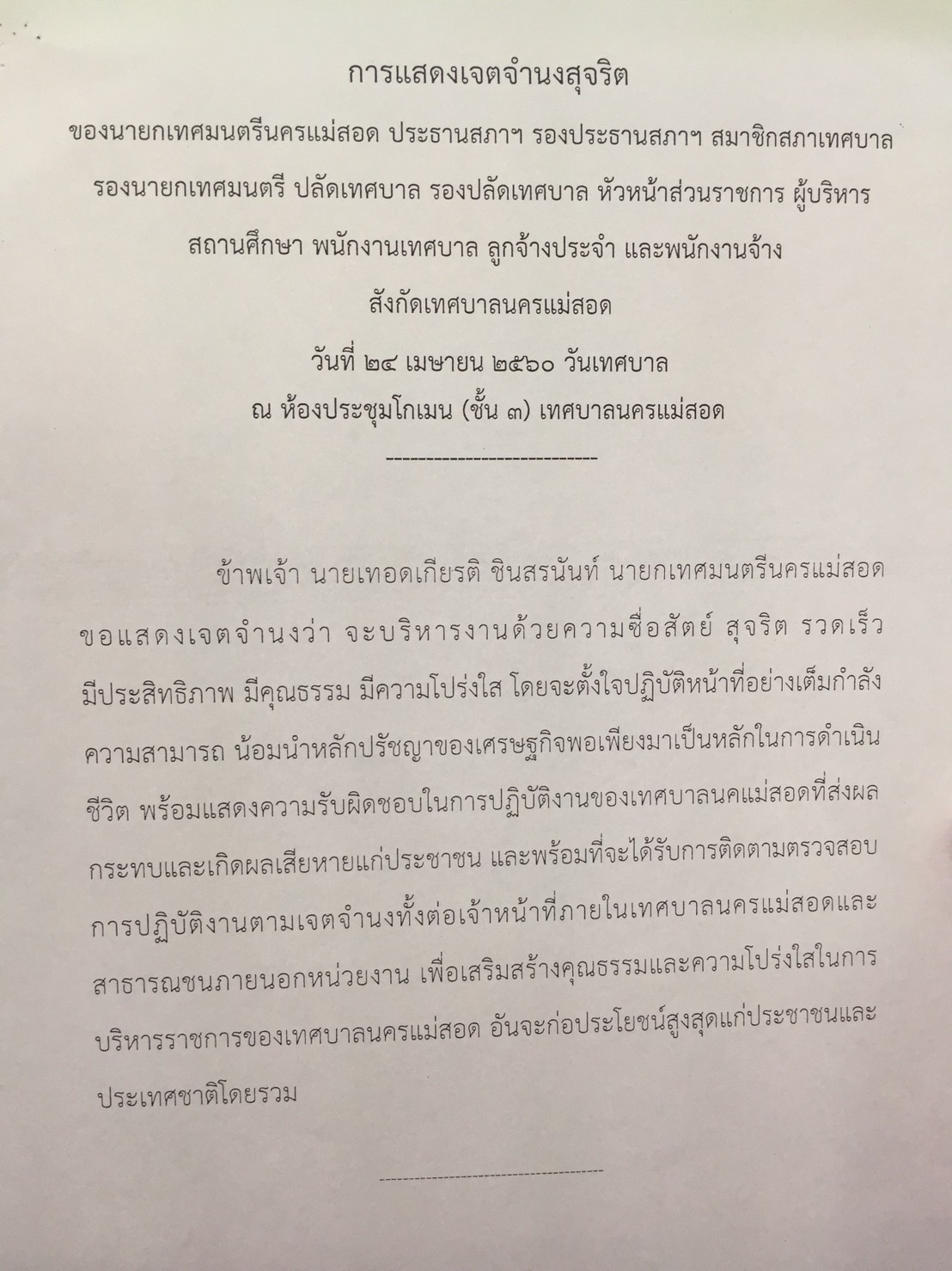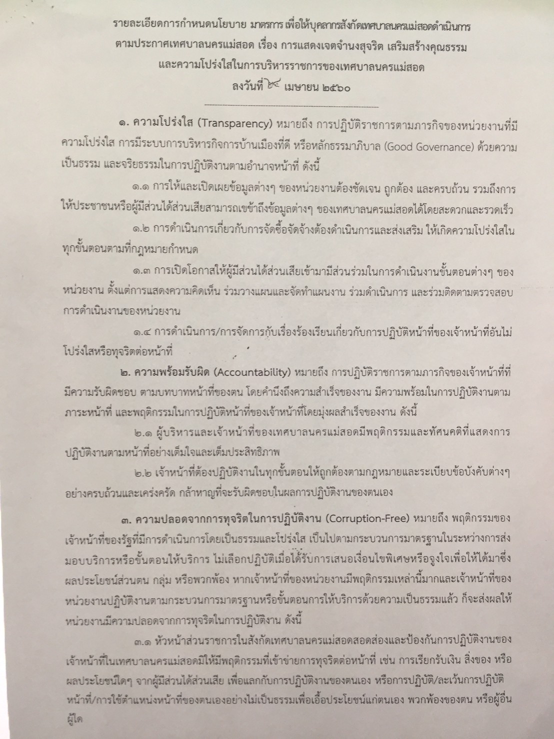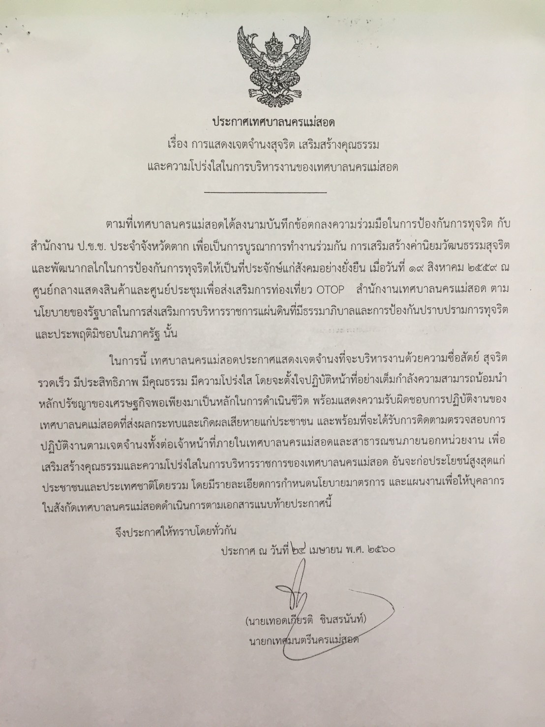 ประกาศเทศบาลนครแม่สอด เรื่อง การแสดงเจตจำนงสุจริต เสริมสร้างคุณธรรมและความโปร่งใสในการบริหารงานของเทศบาล