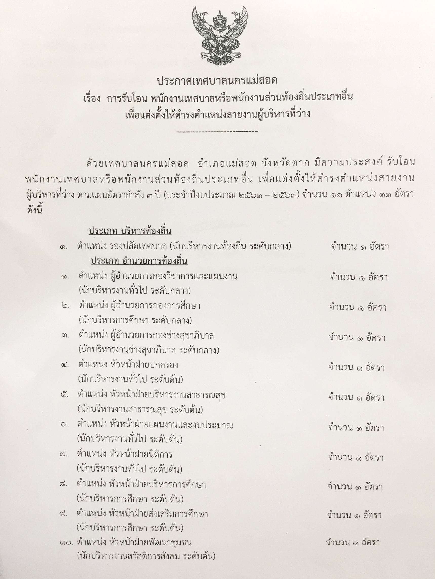 เทศบาลนครแม่สอด รับโอนพนักงานเทศบาลหรือพนักงานส่วนท้องถิ่นประเภทอื่นเพื่อแต่งตั้งให้ดำรงตำแหน่งสายงานผู้บริหารที่ว่าง