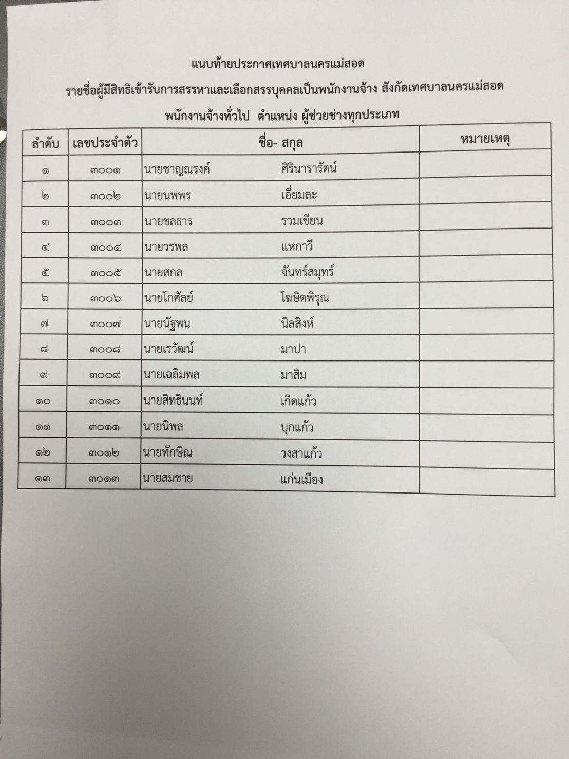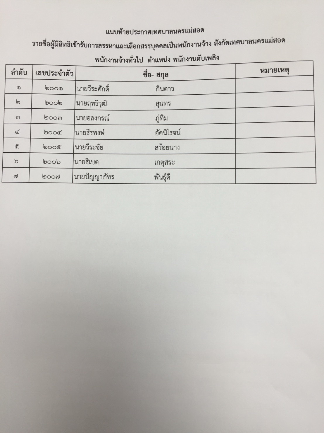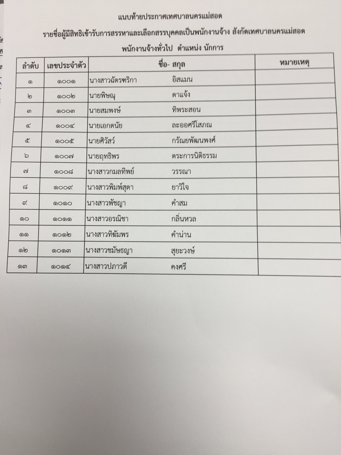 ประกาศรายชื่อผู้มีสิทธิเข้ารับการสรรหาและเลือกสรรบุคคล เป็นพนักงานจ้าง เทศบาลนครแม่สอด