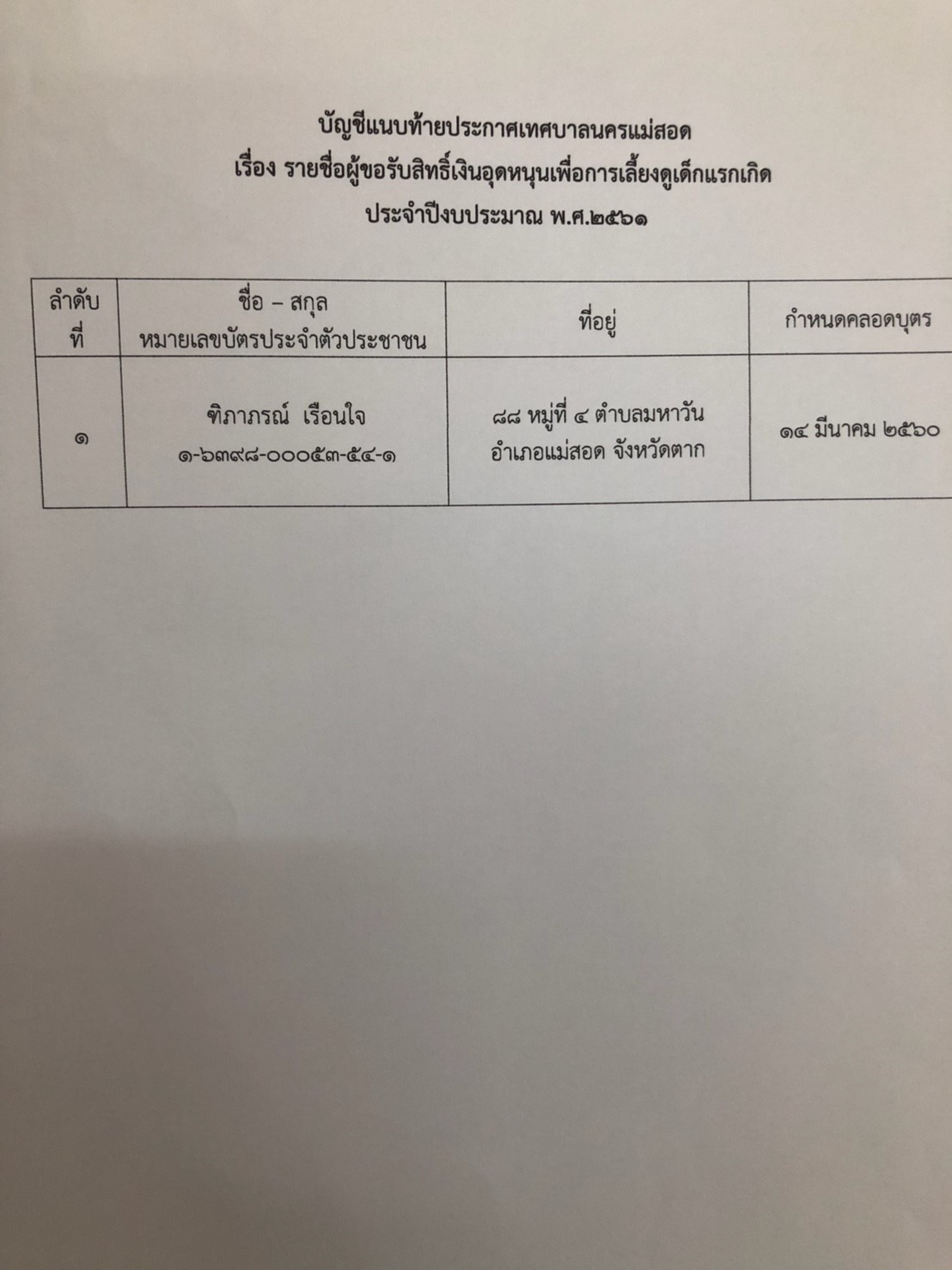 รายชื่อผู้ขอรับสิทธิ์เงินอุดหนุนเพื่อการเลี้ยงดูเด็กแรกเกิด