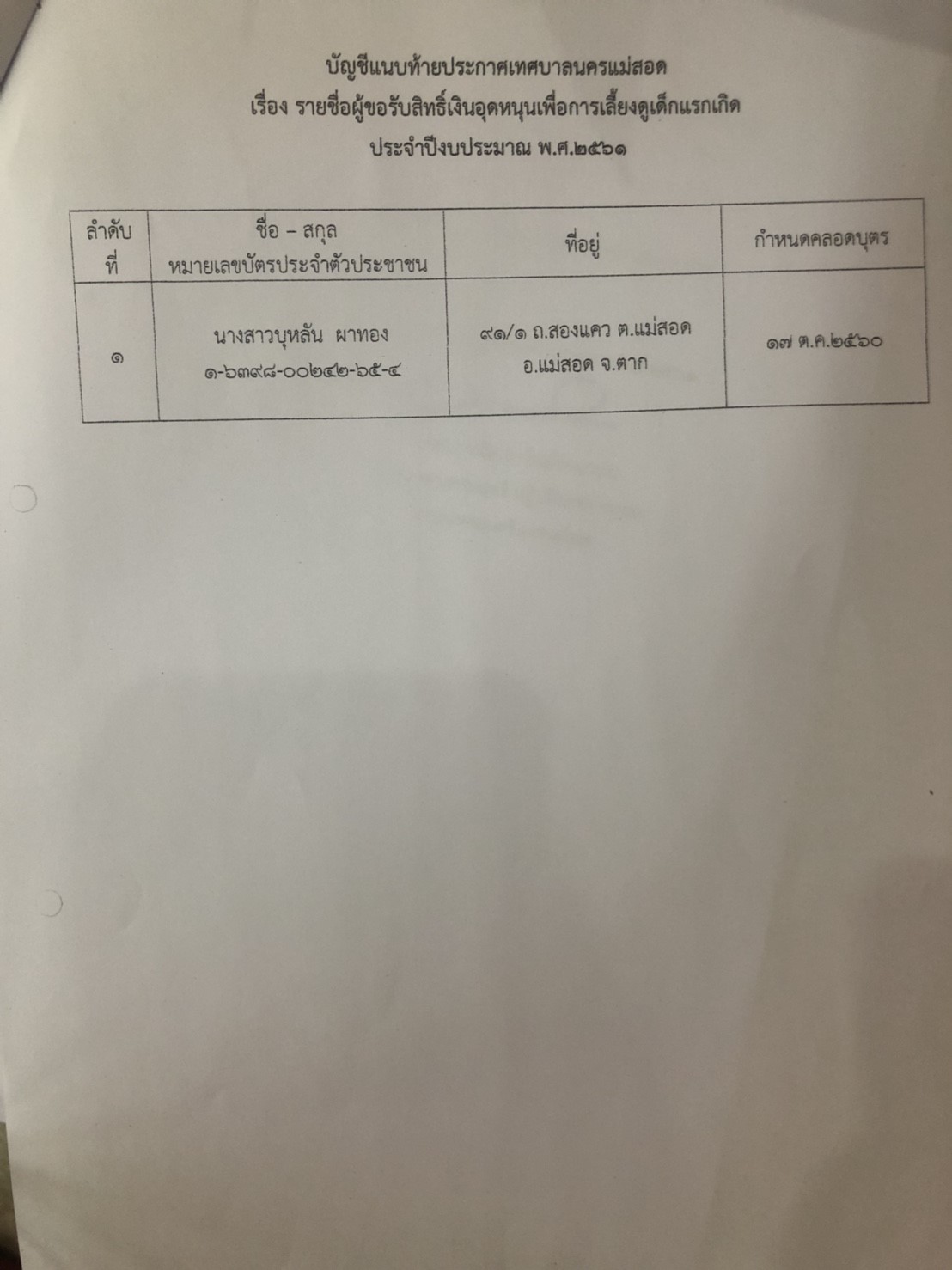บัญชีรายชื่อผู้รับเงินอุดหนุนเด็กแรกเกิด