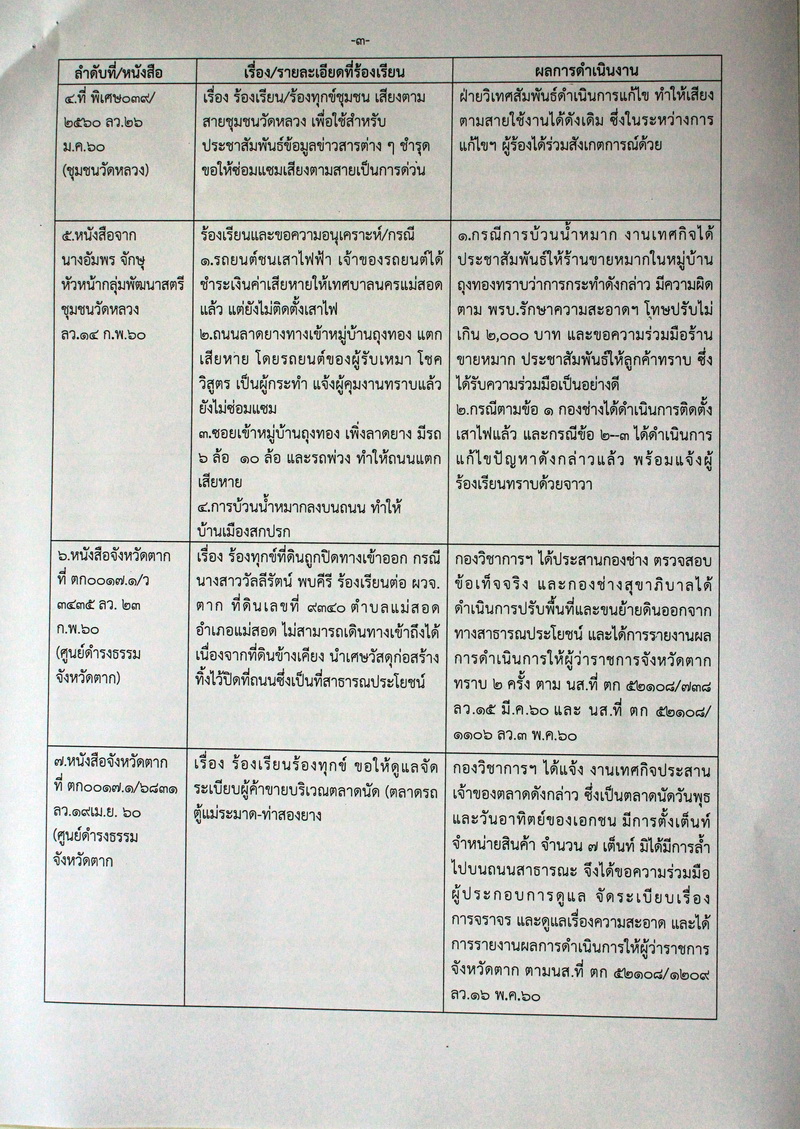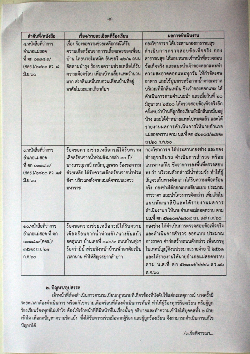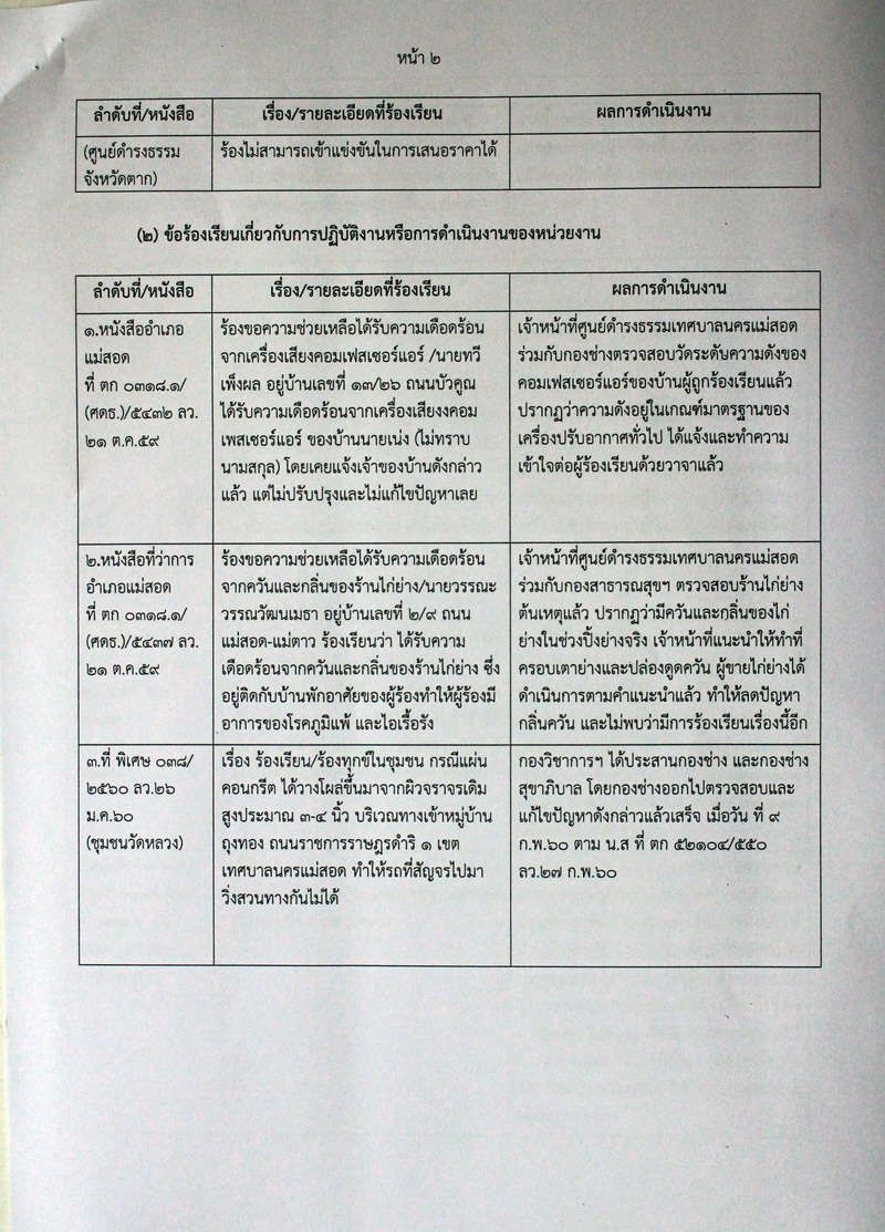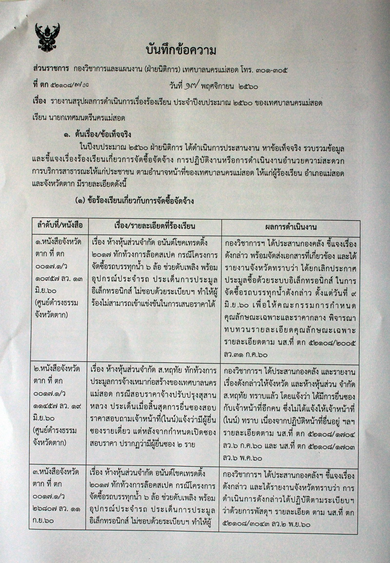 รายงานสรุปผลการดำเนินการเรื่องร้องเรียน ประจำปีงบประมาณ ๒๕๖๐ ของเทศบาลนครแม่สอด
