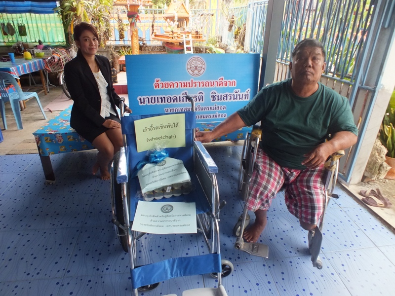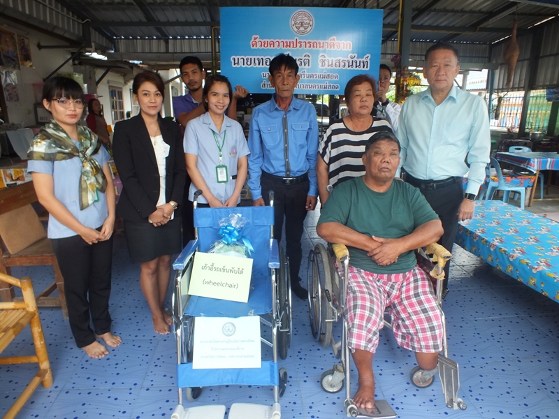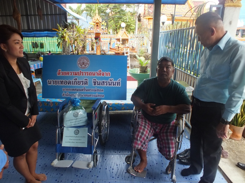 เมื่อวันพฤหัสบดีที่ 29 ธันวาคม 2560 เวลา 08.30 น. ดร.เทอดเกียรติ ชินสรนันท์ นายกเทศมนตรีนครแม่สอด เจ้าหน้าที่กองสวัสดิการสังคม และคลีนิคชุมชนอบอุ่น ได้ลงพื้นที่ณบ้านเลขที่ 56/14 ซอยบุญญาวาส ถนนอินทระคีรี ตำบลแม่สอด อำเภอแม่สอด จังหวัดตาก เพื่อมอบอุปกรณ์ประเภทเก้าอี้รถเข็นพับได้แก่ นายพผัด เมืองมา ผู้สูงอายุชุมชนบ้านนาสามัคคีซึ่งมีความพิการทางการเคลื่อนไหวเพื่อให้สามารถมีความสะดวกและอิสระในการดำเนินชีวิตประจำวันได้ดียิ่งขึ้น