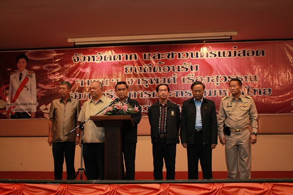 7 ส.ค.56 นายจารุพงศ์ เรืองสุวรรณ รัฐมนตรีว่าการกระทรวงมหาดไทย พร้อมด้วยคณะได้เดินทางไปที่อำเภอแม่สอด จังหวัดตาก ด้วยเครื่องบินโดยสาร โดยมีนายสุริยะ ประสาทบัณฑิต ผวจ.ตาก ดร.เทอดเกียรติ ชินสรนันท์ นายกเทศมนตรีนครแม่สอด พร้อมคณะให้การต้อนรับ ทั้งนี้เพื่อไปสถานการณ์น้ำท่วมและเพื่อประชุมร่วมกับส่วนราชการที่เกี่ยวข้องในการป้องกัน และแก้ไขปัญหาน้ำท่วม