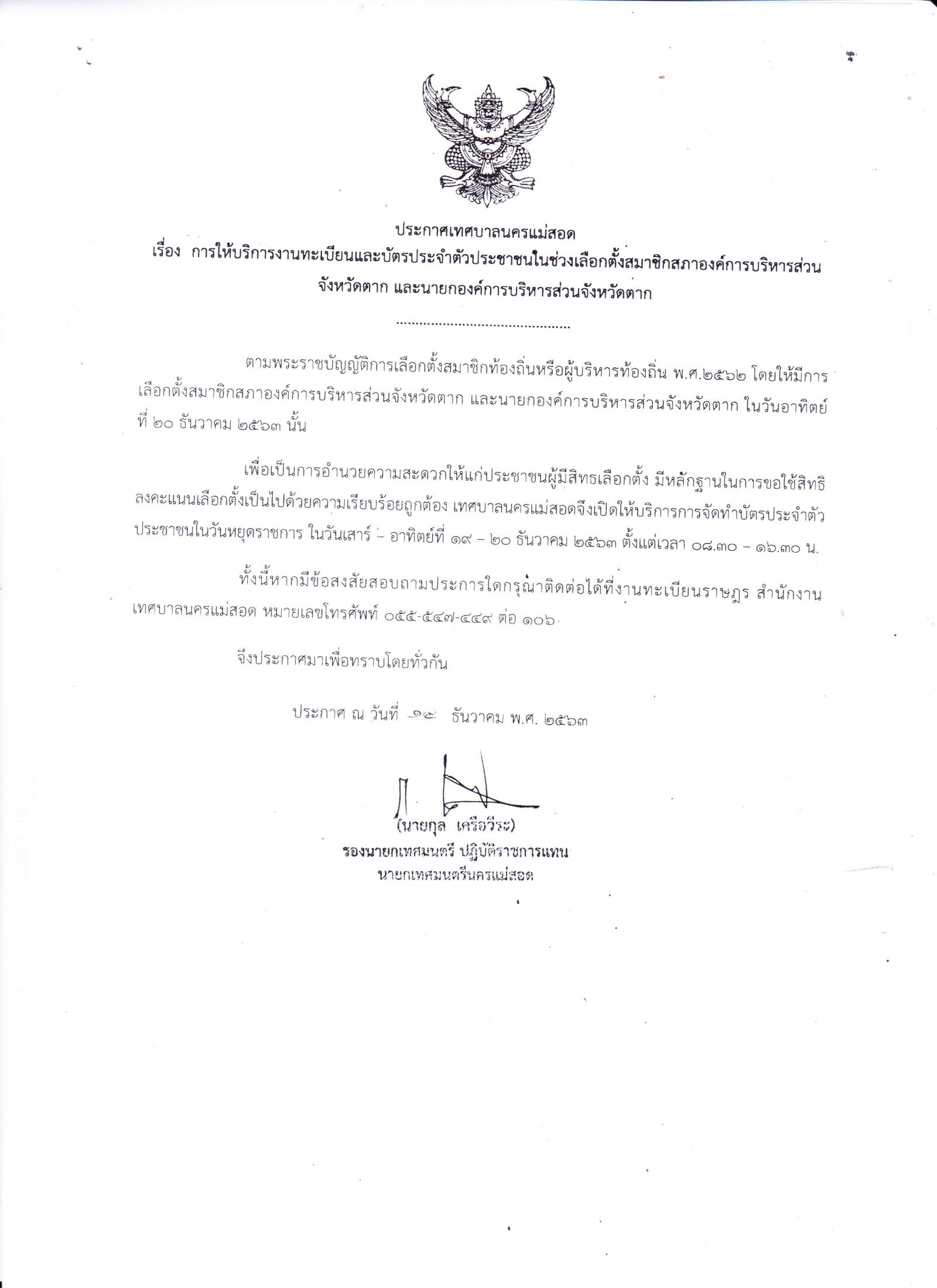 ประกาศเทศบาลนครแม่สอด เรื่อง การให้บริการงานทะเบียนและบัตรประจำตัวประชาชนใหม่ในช่วงเลือกตั้งสมาชิกสภาองค์การบริหารส่วนจังหวัดตากและนายกองค์การบริหารส่วนจังหวัดตาก