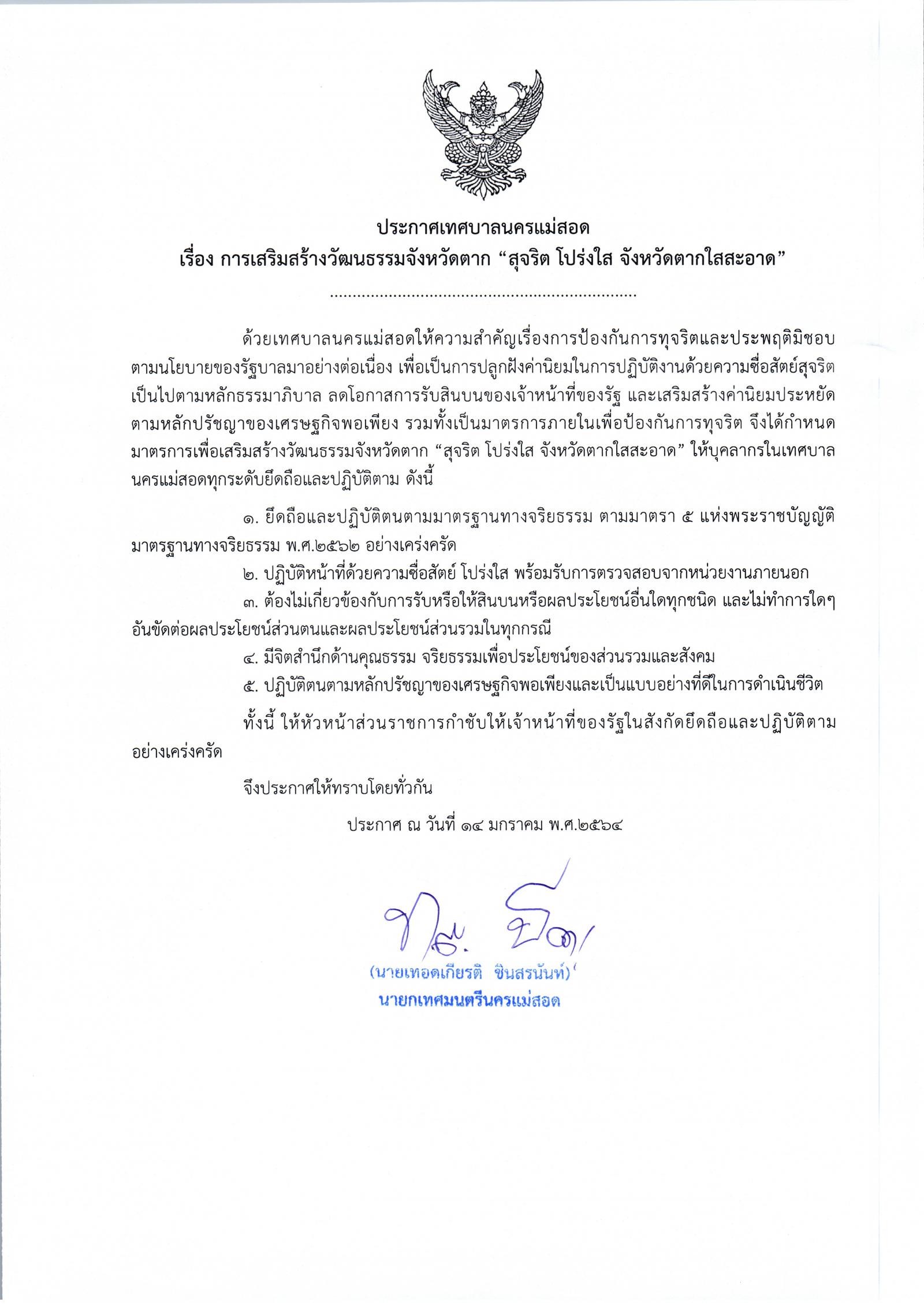 ประกาศเทศบาลนครแม่สอด เรื่อง การเสริมสร้างวัฒนธรรมจังหวัดตาก