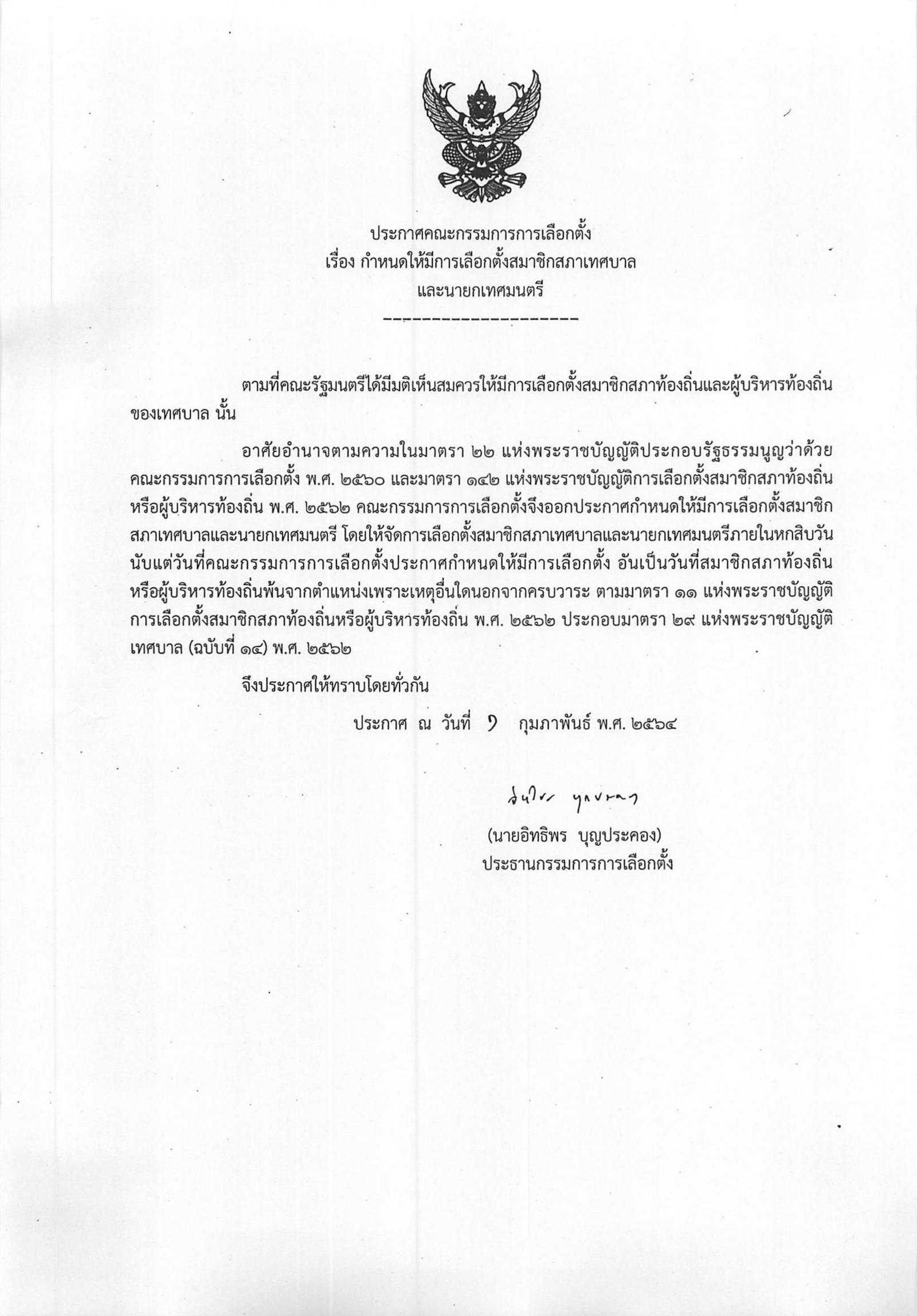 ประกาศคณะกรรมการการเลือกตั้ง เรื่อง กำหนดให้มีการเลือกตั้งสมาชิกสภาเทศบาล และนายกเทศมนตรี