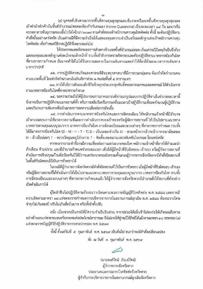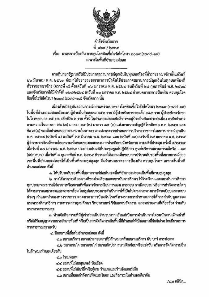 คำสั่งจังหวัดตาก ที่ 424/2564 เรื่อง มาตรการป้องกัน ควบคุมโรคติดเชื้อไวรัสโคโรนา 2019 (โควิด-19) เฉพาะในพื้นที่อำเภอแม่สอด