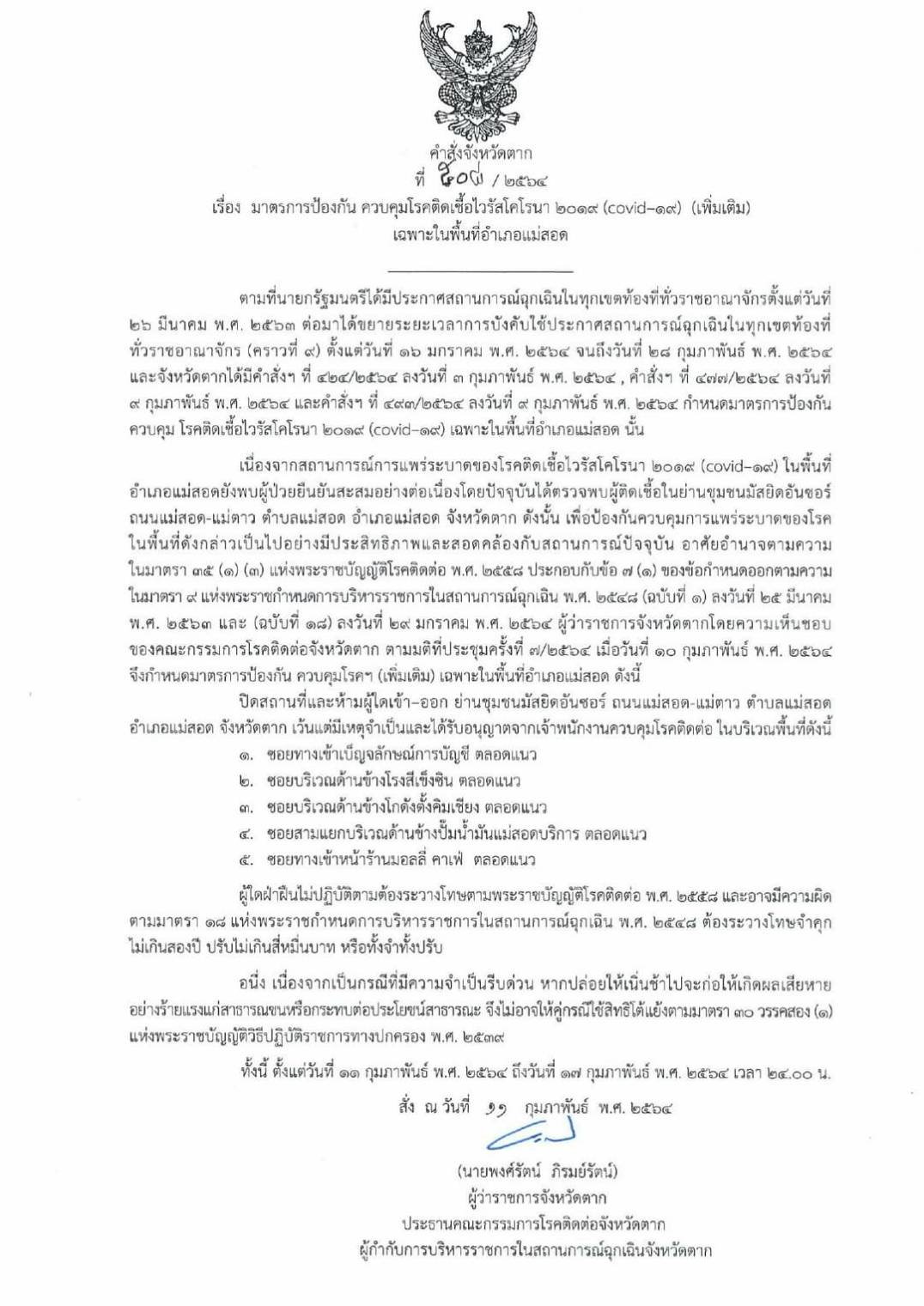 คำสั่งจังหวัดตาก ที่ 508/2564 เรื่อง มาตรการป้องกัน ควบคุมโรคติดเชื้อไวรัสโคโรนา 2019 (โควิด-19) (เพิ่มเติม) เฉพาะในพื้นที่อำเภอแม่สอด