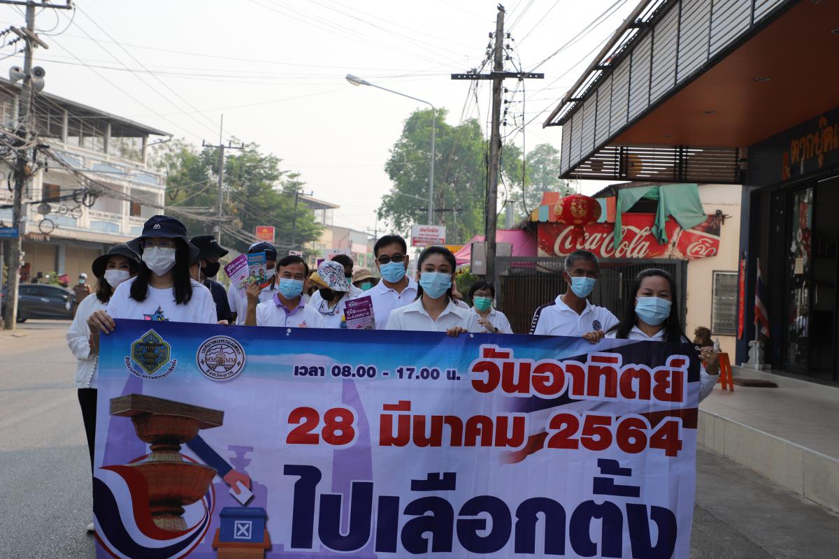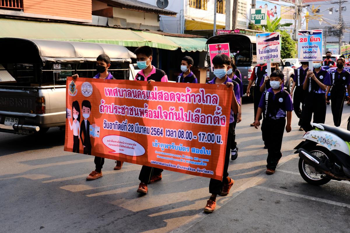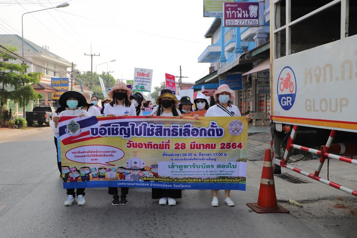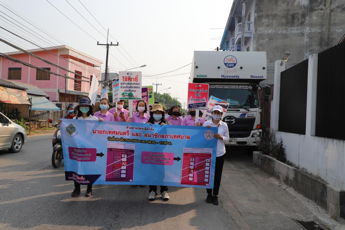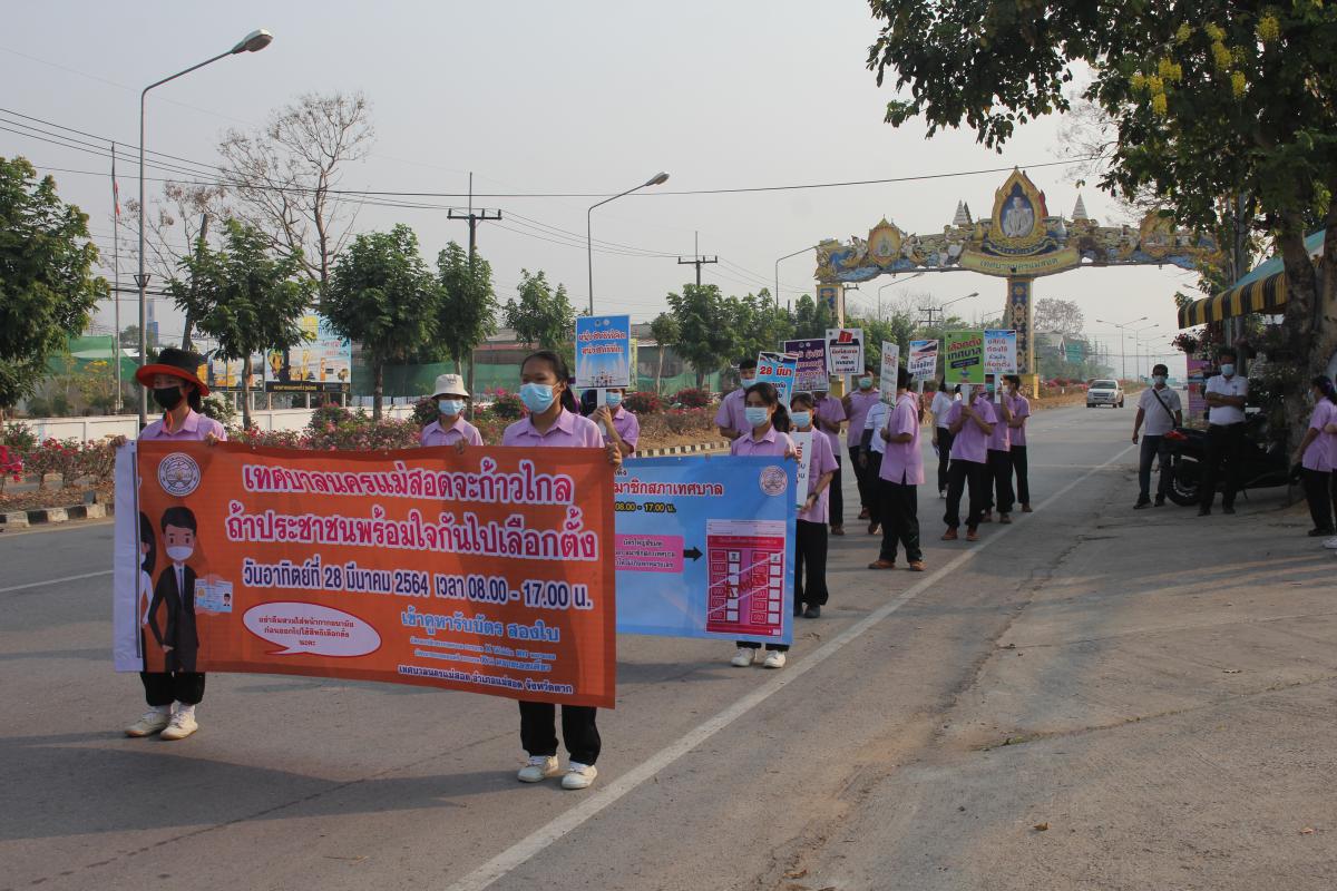 พร้อมทั้งกกต. จ.ตาก ข้าราชการ/พนักงานเทศบาลนครแม่สอด คณะครู นักเรียน ภายในสังกัดเทศบาลนครแม่สอด และนักเรียนโรงเรียนในเขตเทศบาลนครแม่สอด ร่วมเดินรณรงค์ประชาสัมพันธ์การเลือกตั้งสมาชิกสภาเทศบาลและนายกเทศมนตรีนครแม่สอด ภายในเขตเทศบาลนครแม่สอด เพื่อสร้างความรู้ ความเข้าใจและการตระหนักรู้ถึงความสำคัญของการเลือกตั้งให้แก่ประชาชนและเชิญชวนให้ประชาชนไปใช้สิทธิเลือกตั้ง ในวันอาทิตย์ที่ 28 มีนาคม 2564 อย่างพร้อมเพรียงกัน