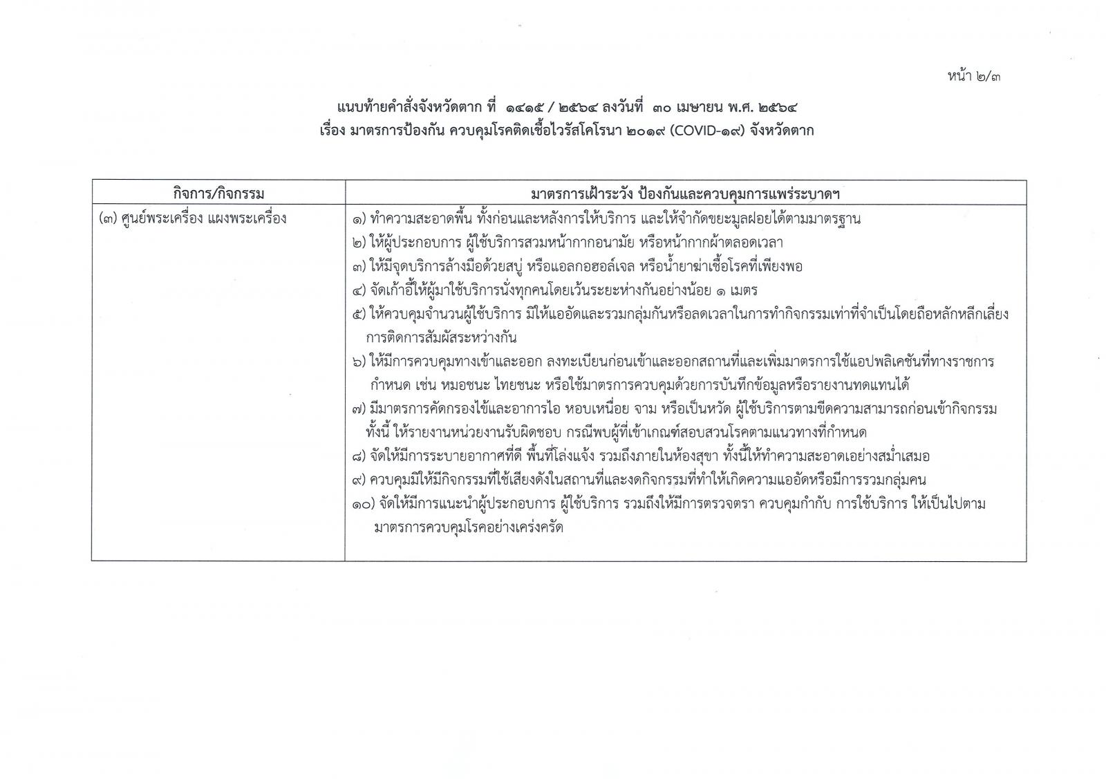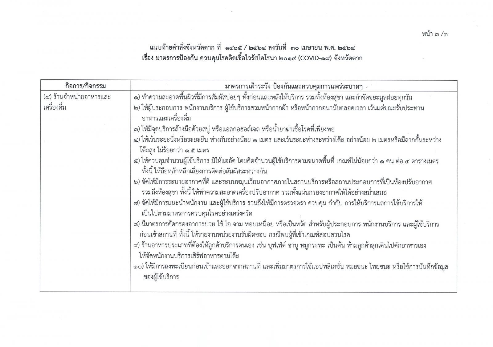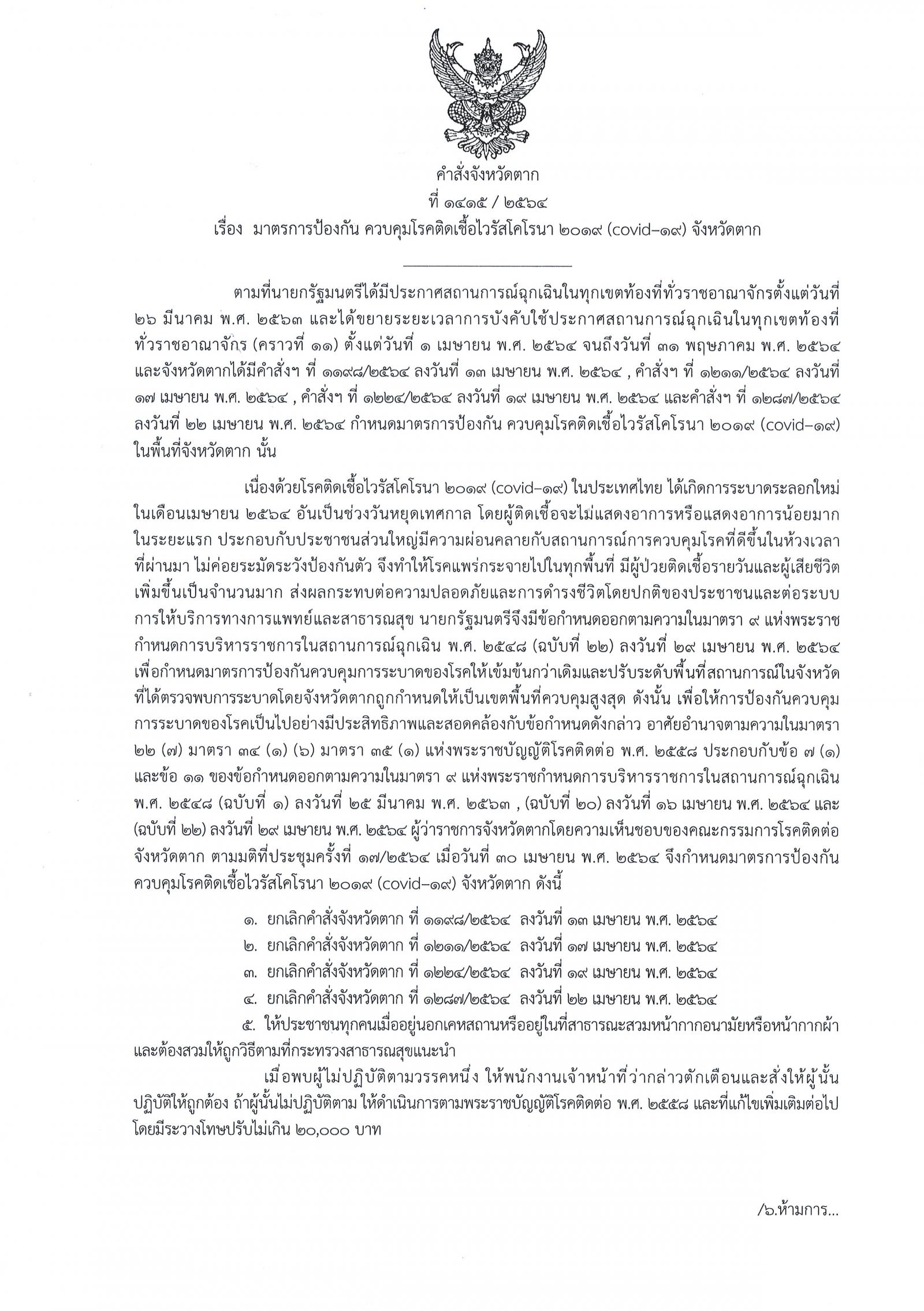 คำสั่งจังหวัดตาก ที่ 2415/2564 เรื่อง มาตรการป้องกัน ควบคุมโรคติดเชื้อไวรัสโคโรนา 2019 (โควิด-19) จังหวัดตาก