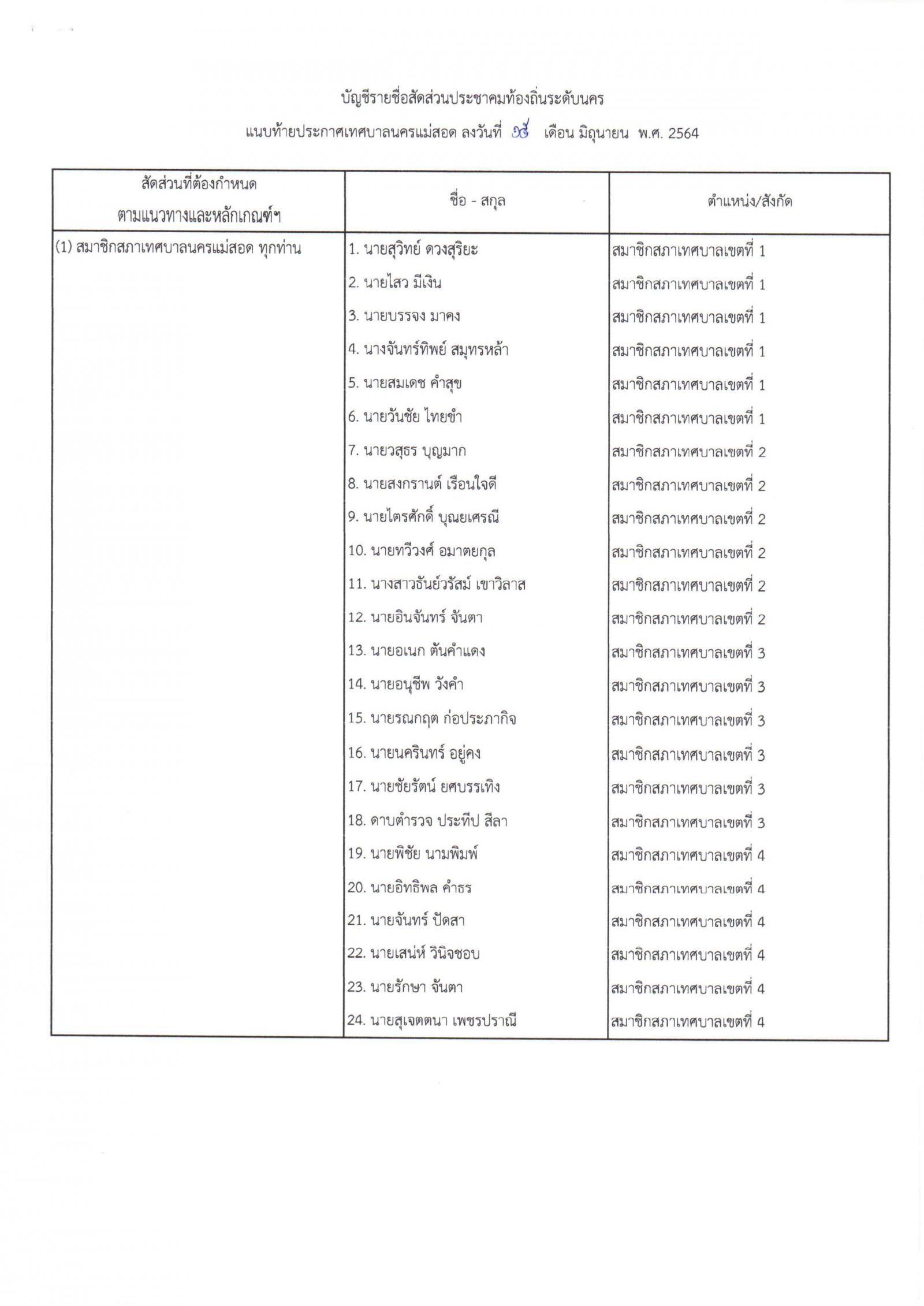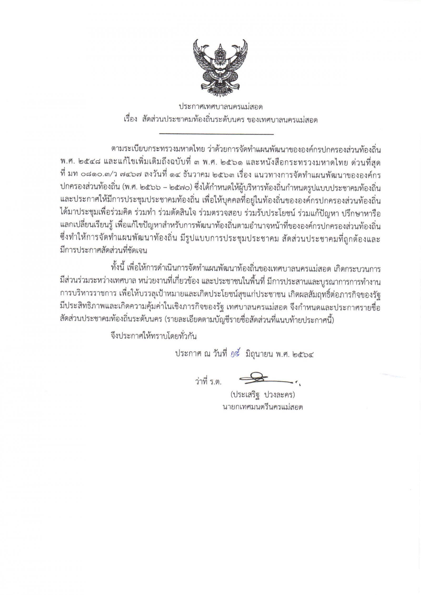 ประกาศเทศบาลนครแม่สอด เรื่อง สัดส่วนประชาคมท้องถิ่นระดับนครของเทศบาลนครแม่สอด