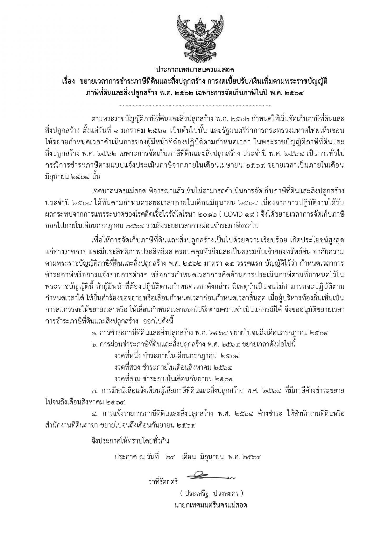 ประกาศเทศบาลนครแม่สอด เรื่อง ขยายเวลากรชำระภาษีที่ดินและสิ่งปลูกสร้าง การงดเบี้ยปรับ/เงินเพิ่มตามพระราชบัญญัติภาษีที่ดินและสิ่งปลูกสร้าง พ.ศ. 2562 เฉพาะการจัดเก็บภาษีในปี พ.ศ. 2564