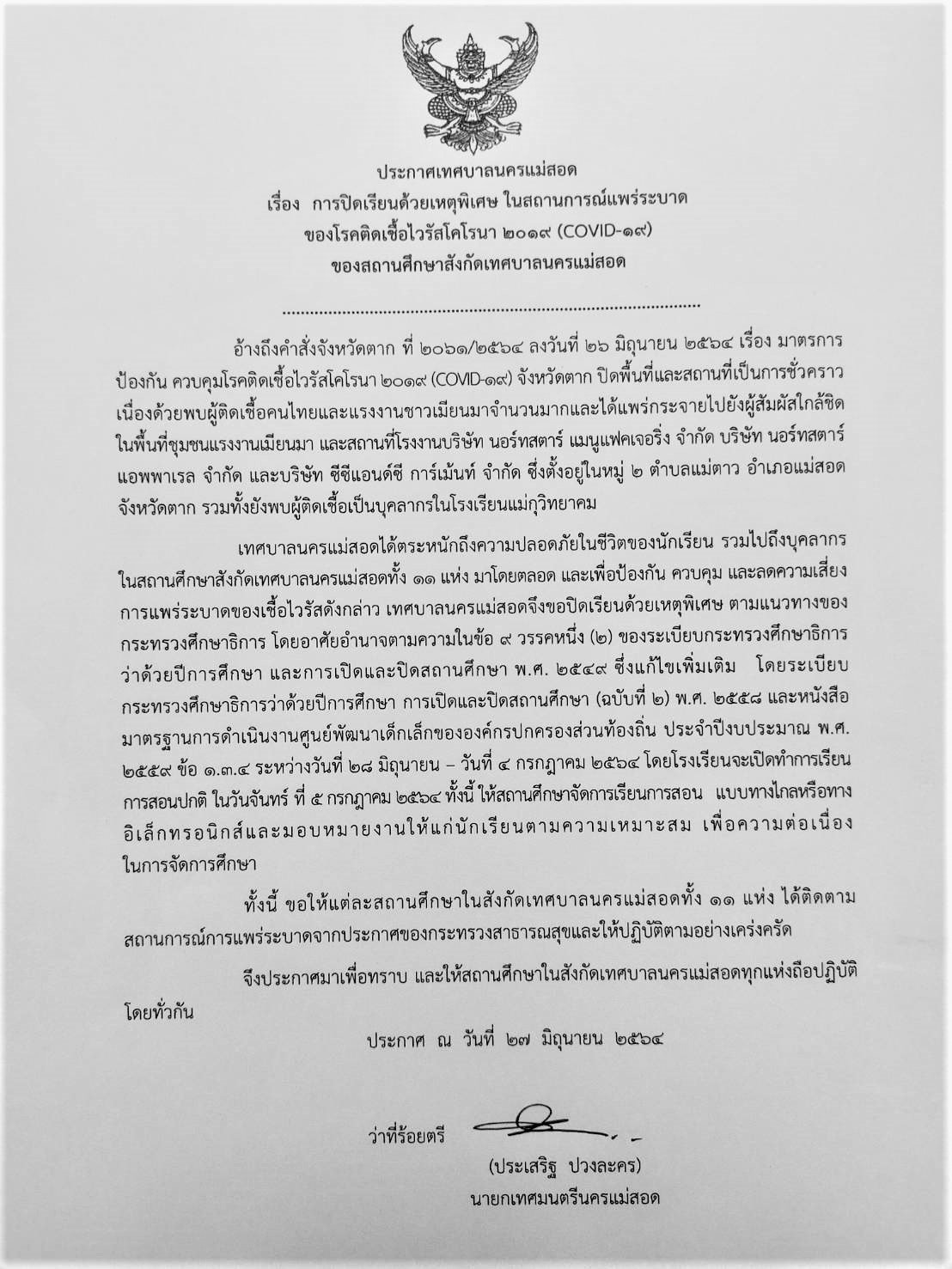 ประกาศเทศบาลนครแม่สอด เรื่อง การปิดเรียนด้วยเหตุพิเศษในสถานการณ์แพร่ระบาดของโรคติดเชื้อไวรัสโคโรนา 2019 (โควิด-19) ของสถานศึกษาสังกัดเทศบาลนครแม่สอด