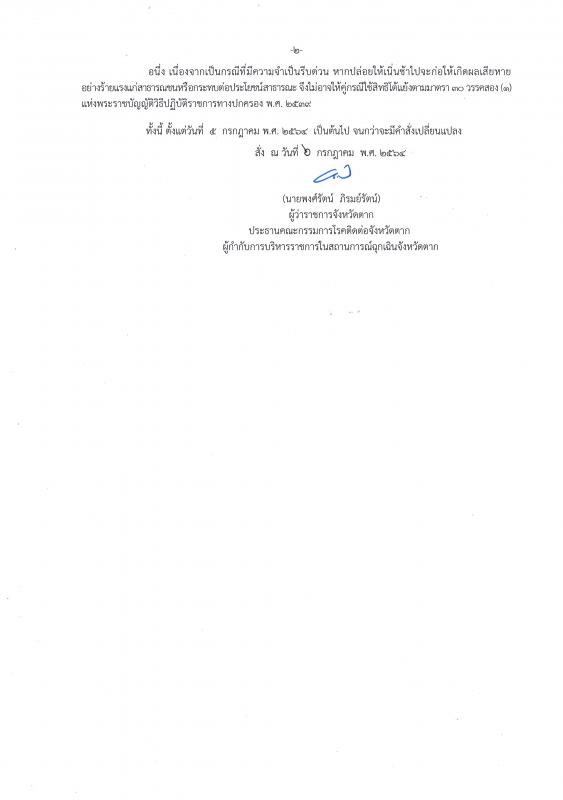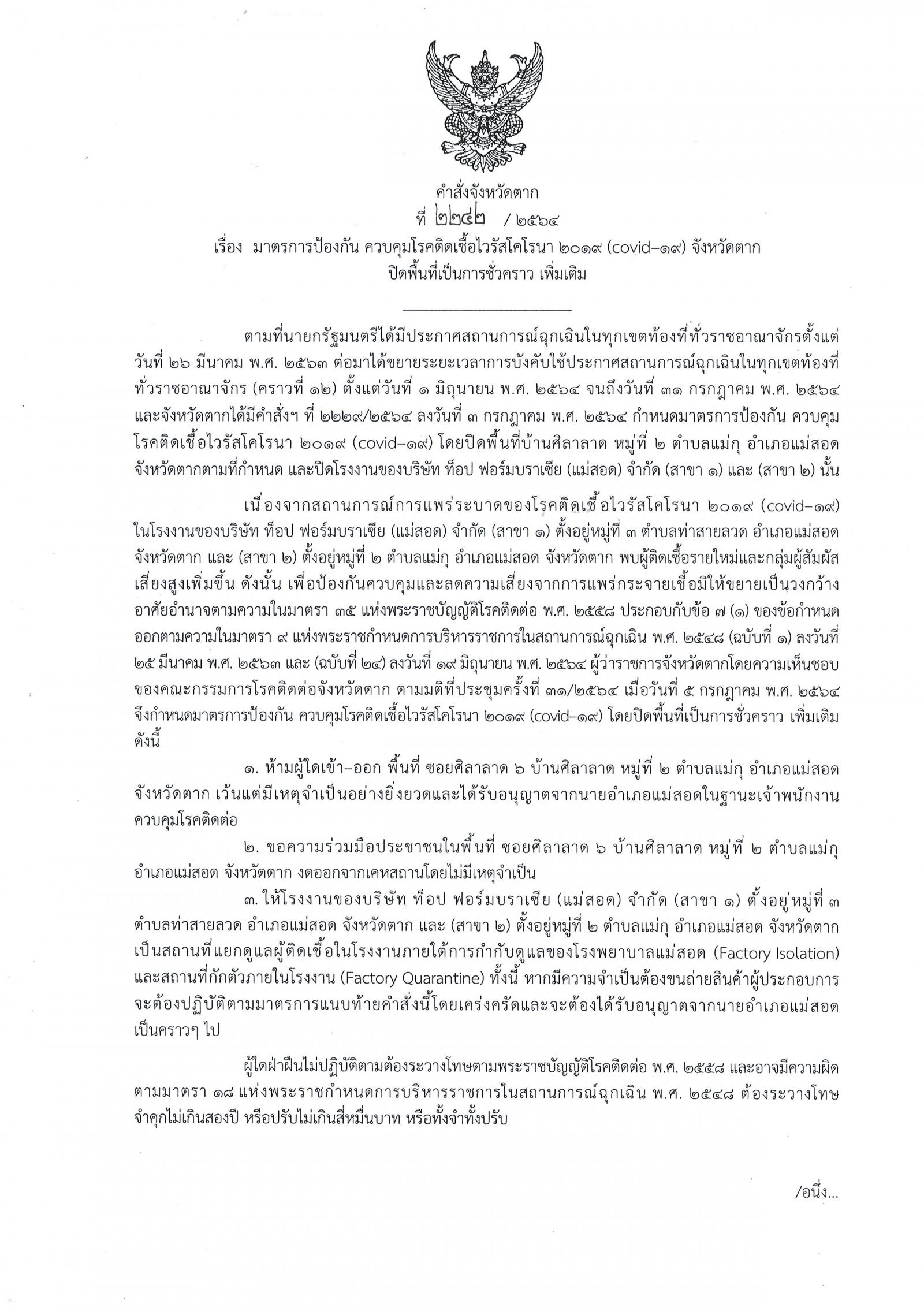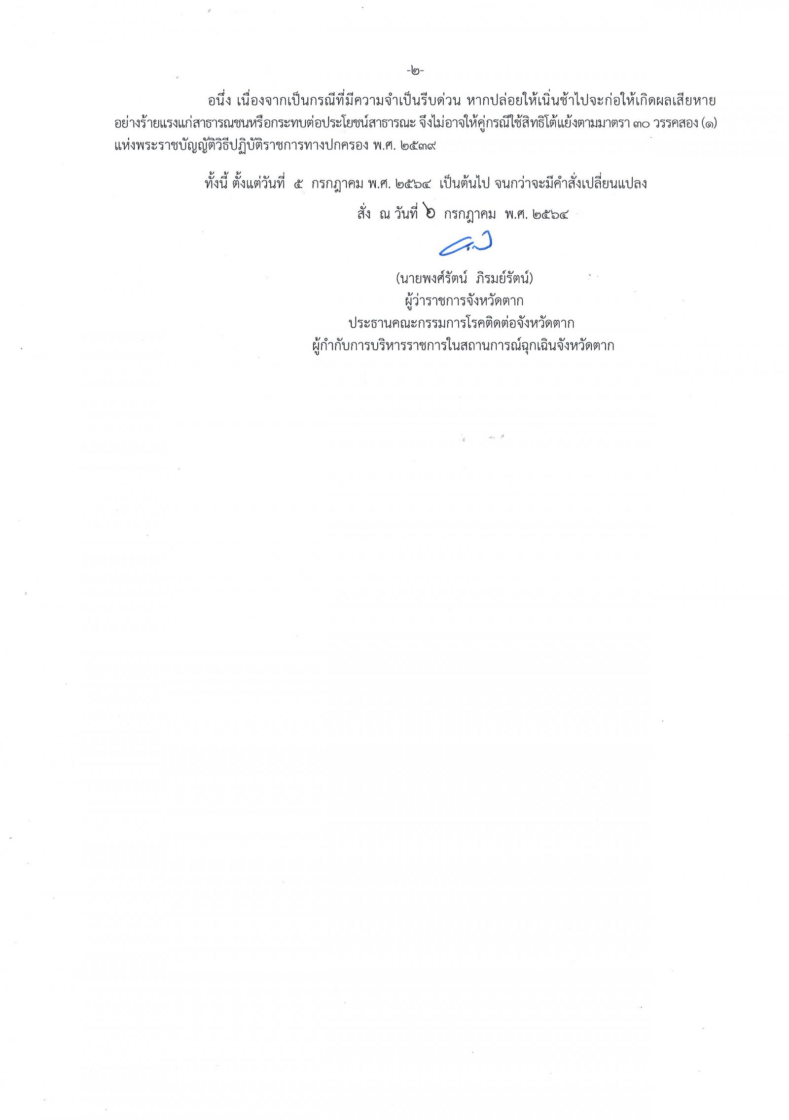 คำสั่งจังหวัดตาก ที่ 2242/2564 เรื่อง มาตรการป้องกัน ควบคุมโรคติดเชื้อไวรัสโคโรนา 2019 (โควิด-19) จังหวัดตาก ปิดพื้นที่เป็นการชั่วคราว เพิ่มเติม