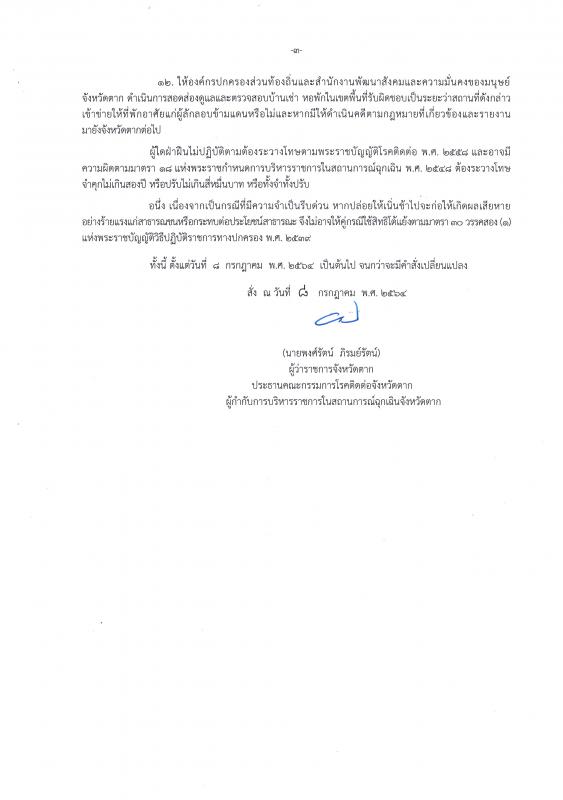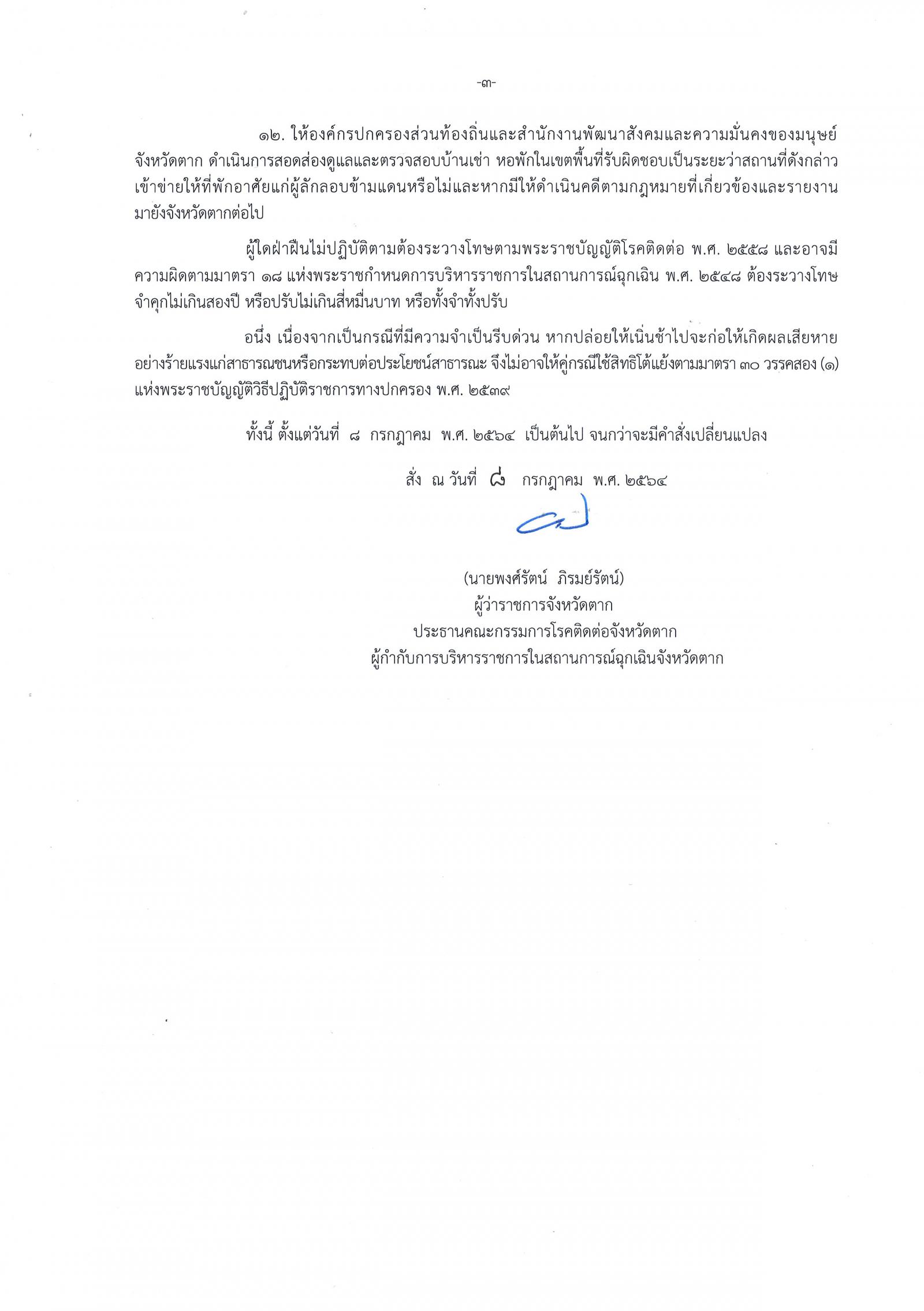คำสั่งจังหวัดตาก ที่ 2267/2564 เรื่องมาตรการป้องกัน ควบคุมโรคติดเชื้อไวรัสโคโรนา 2019 (โควิด-19) จังหวัดตาก เฉพาะในพื้นที่อำเภอแม่สอด เพิ่มเติม