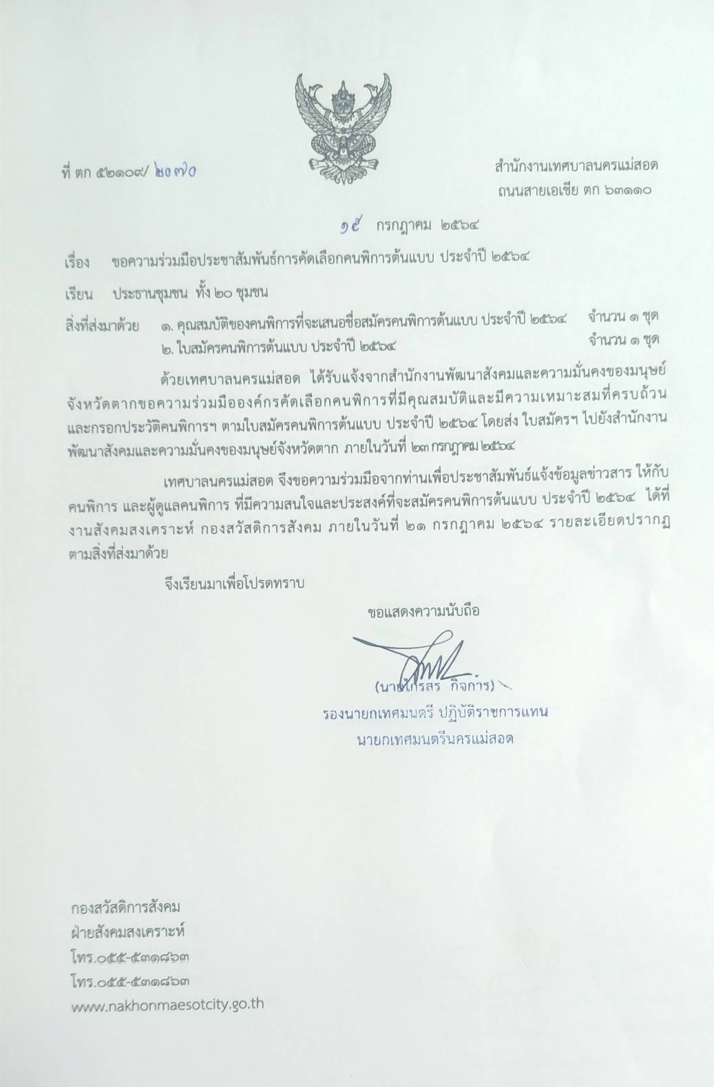 เทศบาลนครแม่สอด ขอประชาสัมพันธ์การคัดเลือกคนพิการต้นแบบ ประจำปี 2564 ให้กับคนพิการและผู้ดูแลคนพิการ หากมีความสนใจและประสงค์ที่จะสมัครได้ที่งานสังคมสงเคราะห์ กองสวัสดิการสังคม ภายในวันที่ 21 กรกฎาคม 2564
