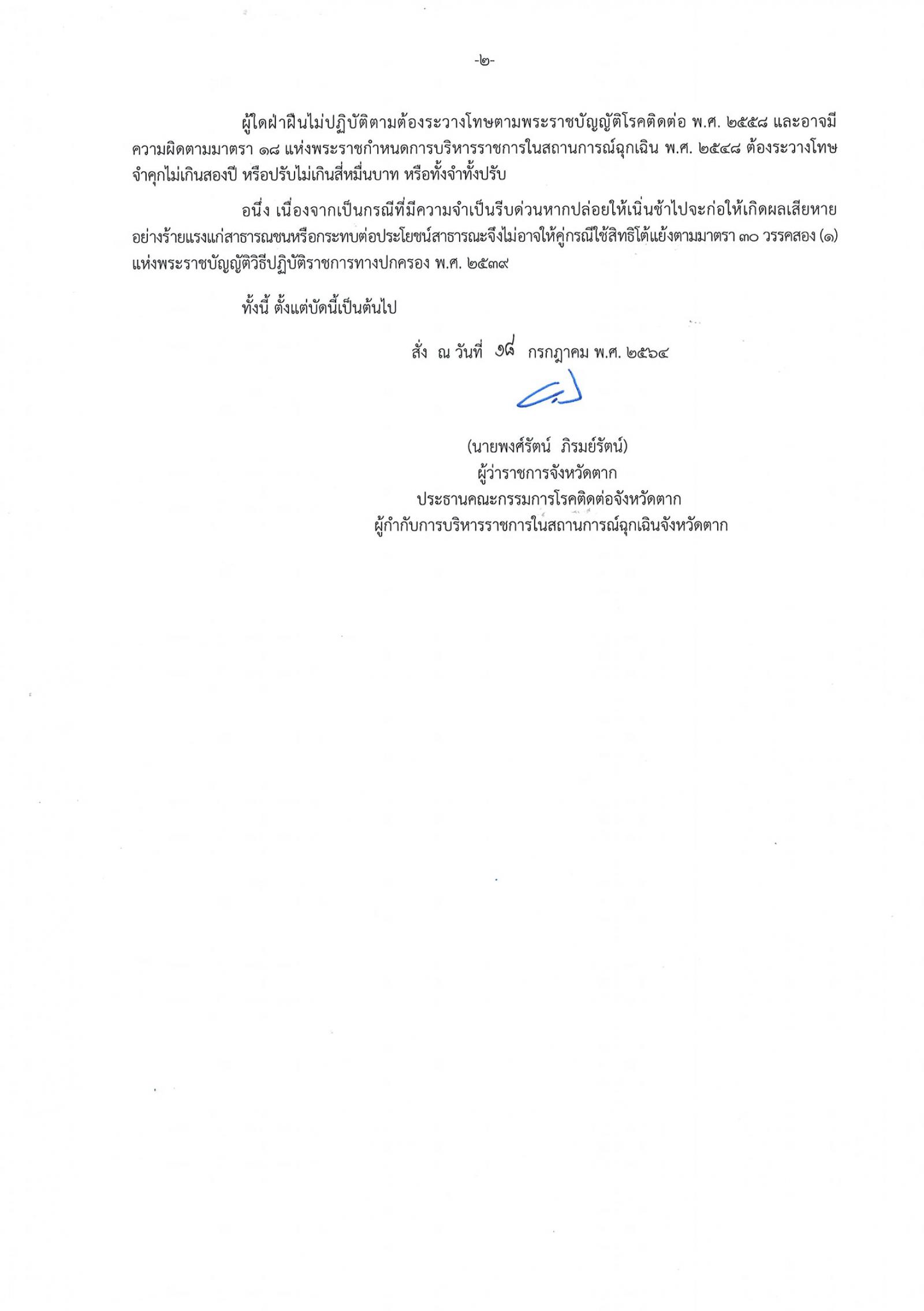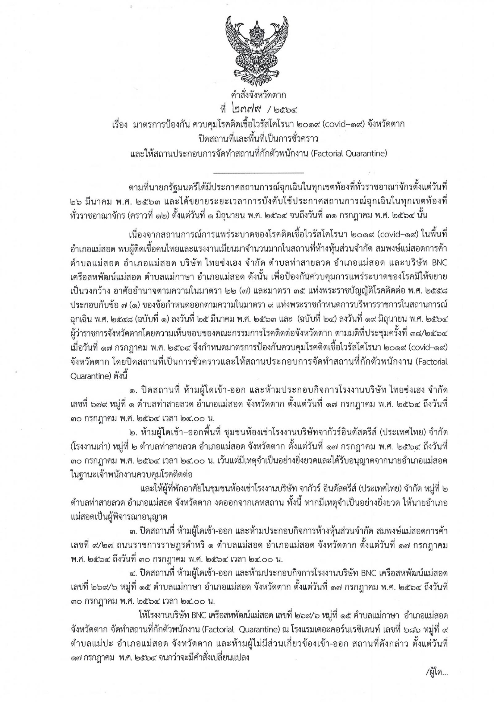 คำสั่งจังหวัดตาก ที่ 2379/2564 เรื่อง มาตรการป้องกัน ควบคุมโรคติดเชื้อไวรัสโคโรนา 2019 (โควิด-19) จังหวัดตาก ปิดสถานที่และพื้นที่เป็นการชั่วคราวและให้สถานประกอบการจัดทำสถานที่กักตัวพนักงาน