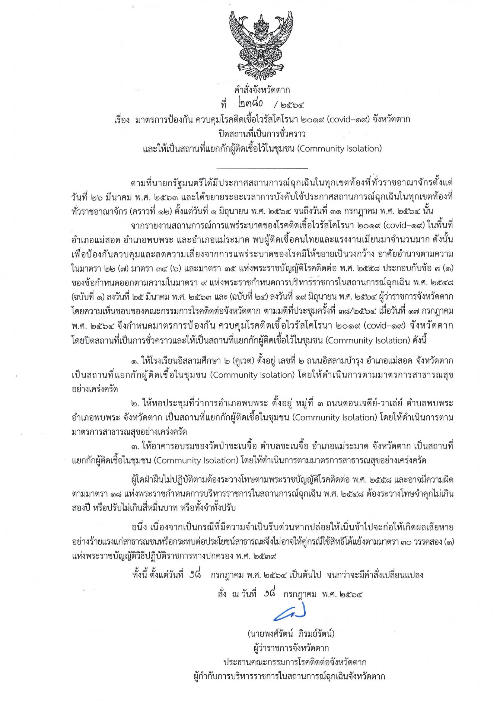 คำสั่งจังหวัดตาก ที่ 2380/2564 เรื่อง มาตรการป้องกัน ควบคุมโรคติดเชื้อไวรัสโคโรนา 2019 (โควิด-19) จังหวัดตาก ปิดสถานที่และพื้นที่เป็นการชั่วคราวและให้เป็นสถานที่แยกกักผู้ติดเชื้อไวในชุมชน