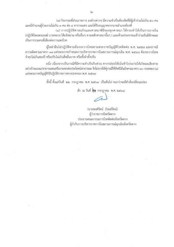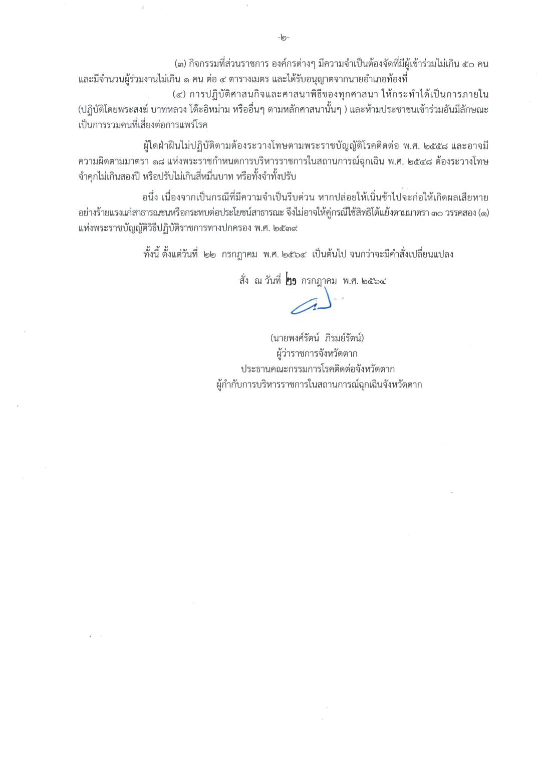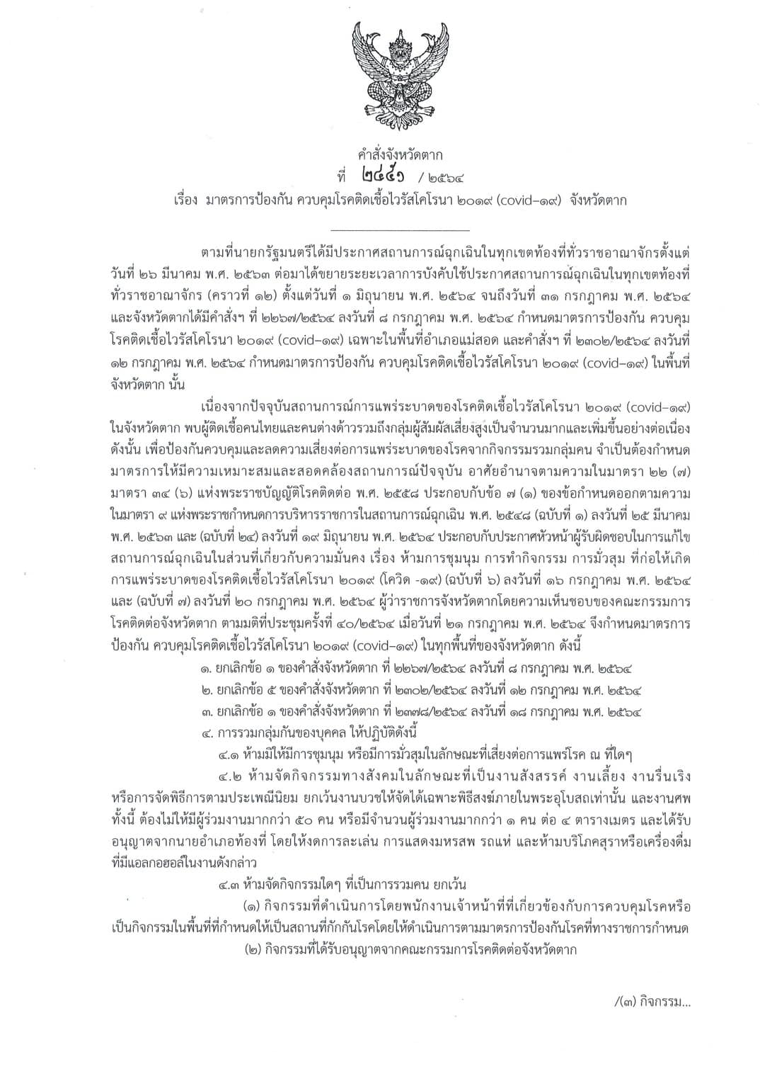 คำสั่งจังหวัดตาก ที่ 2451/2564 เรื่อง มาตรการป้องกัน ควบคุมโรคติดเชื้อไวรัสโคโรนา 2019 (โควิด-19) จังหวัดตาก