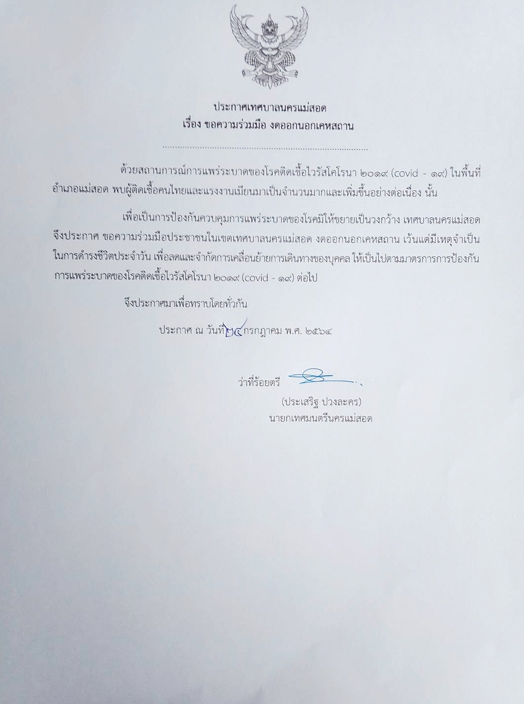 ประกาศเทศบาลนครแม่สอด เรื่อง ขอความร่วมมืองดออกนอกเคหสถาน